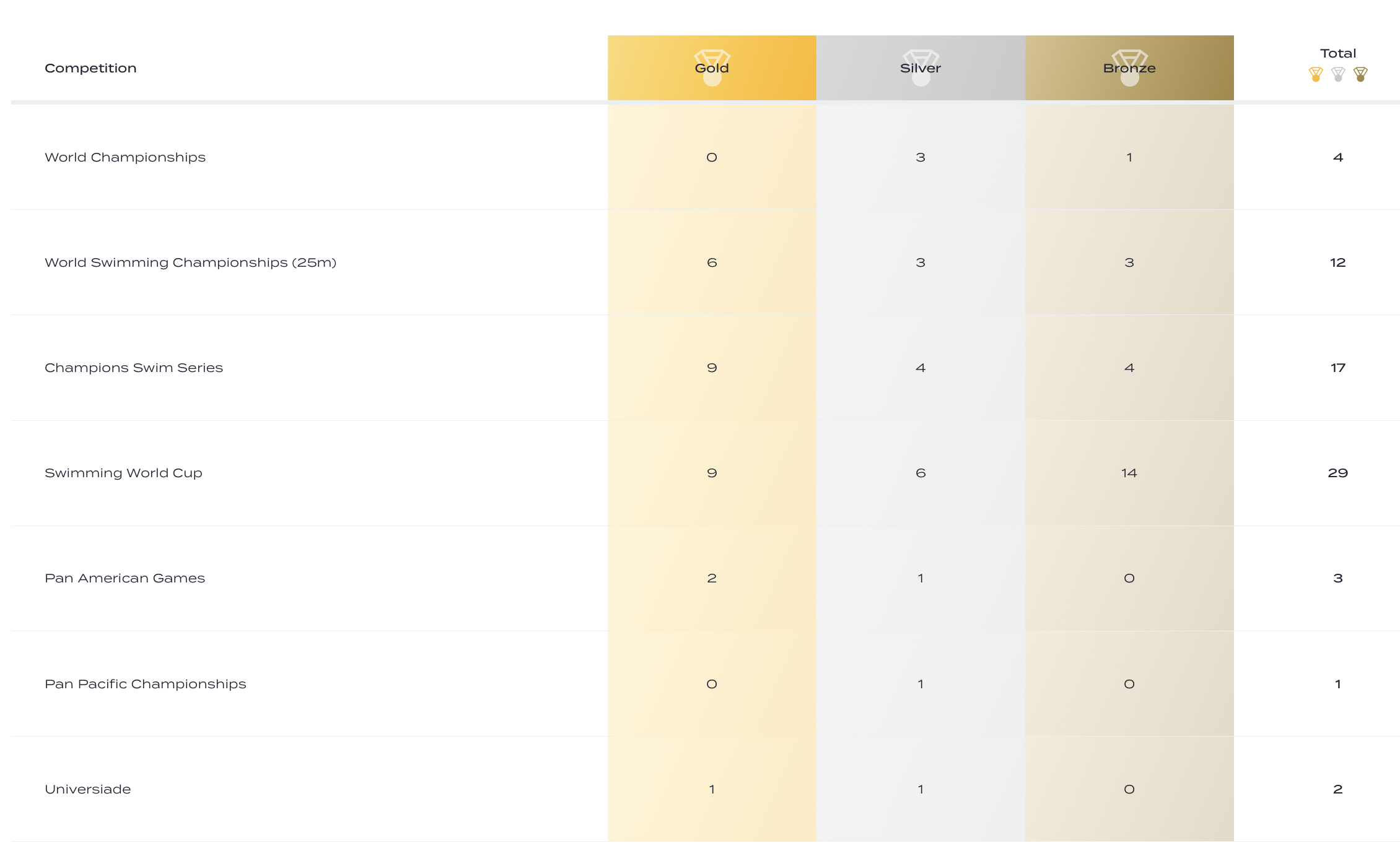 Specialista dei 50 farfalla, ha conquistato tre titoli mondiali in vasca corta (2012, 2018 e 2021), firmando nel 2018 il record del mondo con 21"81 e diventando, a 38 anni, il nuotatore più anziano di sempre a vincere un titolo iridato. In vasca lunga ha collezionato tre argenti e un bronzo mondiale tra il 2015 e il 2022, arricchendo un palmarès straordinario che conta complessivamente 62 medaglie internazionali in carriera.