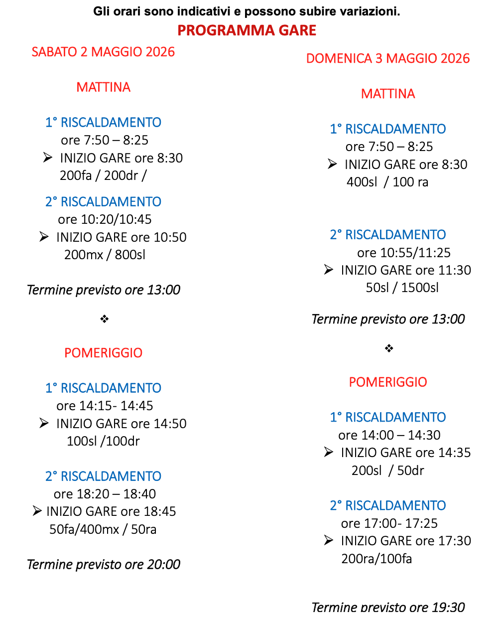 Sarà disponibile la vasca di riscaldamento durante lo svolgimento delle gare.