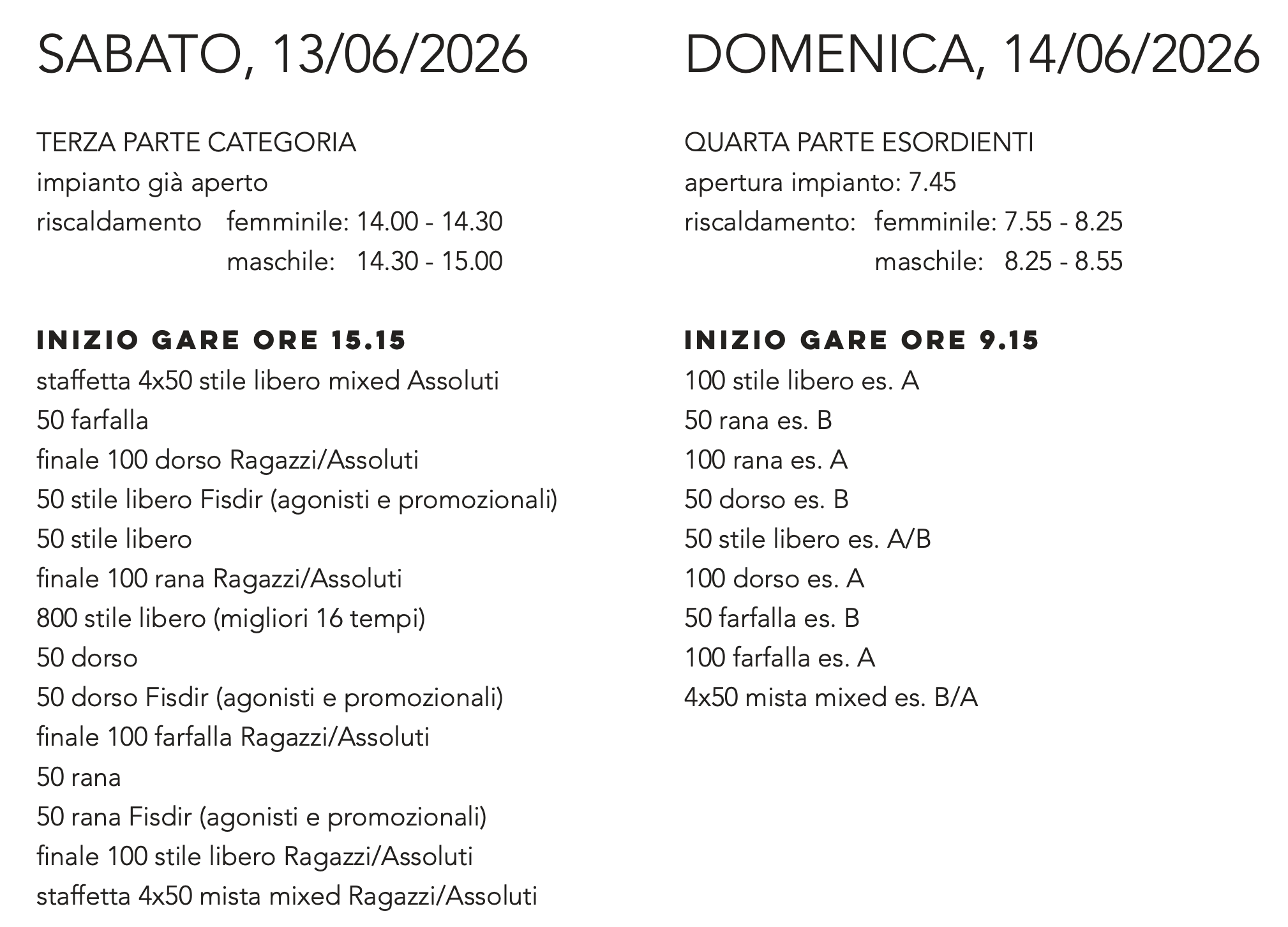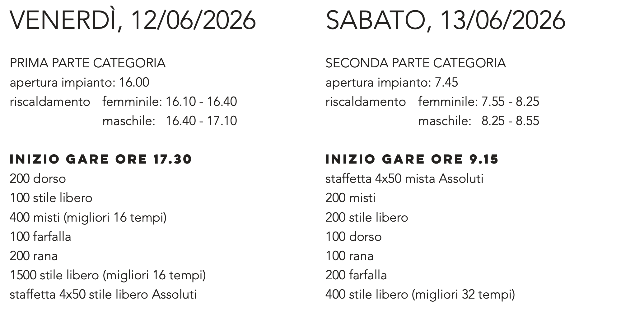 Venerdì 12 e sabato 13 giugno (categoria), domenica 14 giugno (esordienti). Confermata anche in questa edizione la partecipazione degli atleti Fisdir.