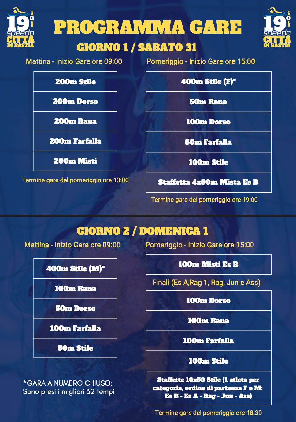 Il Centro Nuoto Bastia organizza la 19ª edizione del Trofeo “Città di Bastia”, in programma sabato 31 gennaio e domenica 1 febbraio 2026 presso la Piscina Comunale di Bastia Umbra (Perugia). Il meeting, disputato in vasca corta da 25 metri a 8 corsie con cronometraggio automatico, è aperto alle categorie Esordienti B e A, Ragazzi, Juniores, Cadetti e Seniores