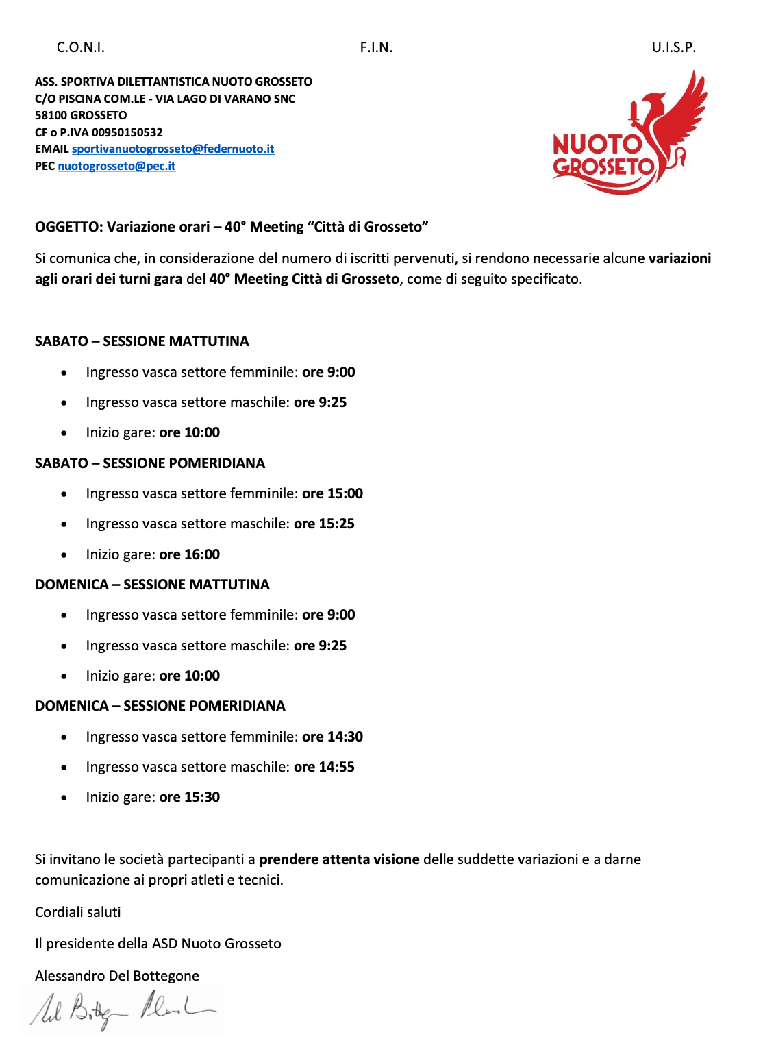 Gli organizzatori del 40° Meeting Città di Grosseto comunicano una variazione degli orari come segue.