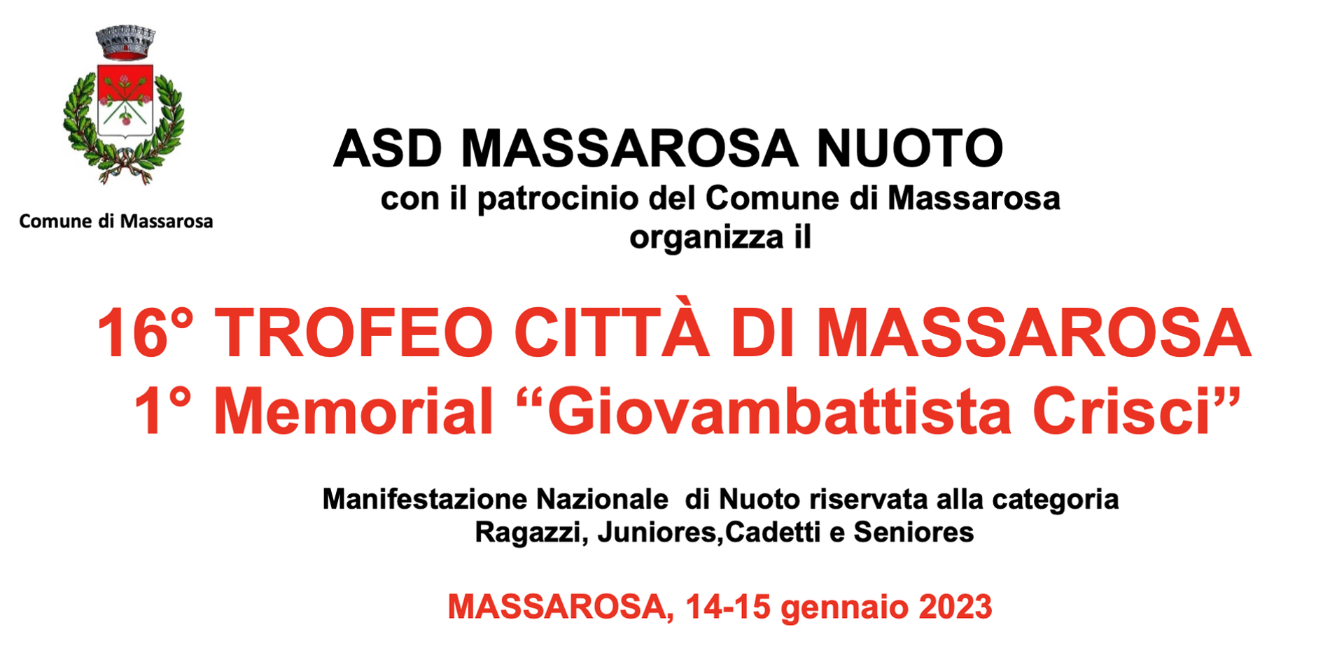 ASD MASSAROSA NUOTO con il patrocinio del Comune di Massarosa in data 14 e 15 gennaio organizza il 16° TROFEO CITTÀ DI MASSAROSA - 1° Memorial “Giovambattista Crisci”, patron del Mussi-Lombardi-Femiano deceduto il 7 febbraio 2021, la manifestazione si svolgerà presso la Piscina Comunale Giovanni Frati di Massarosa (LU), base 25 metri, 6 corsie.