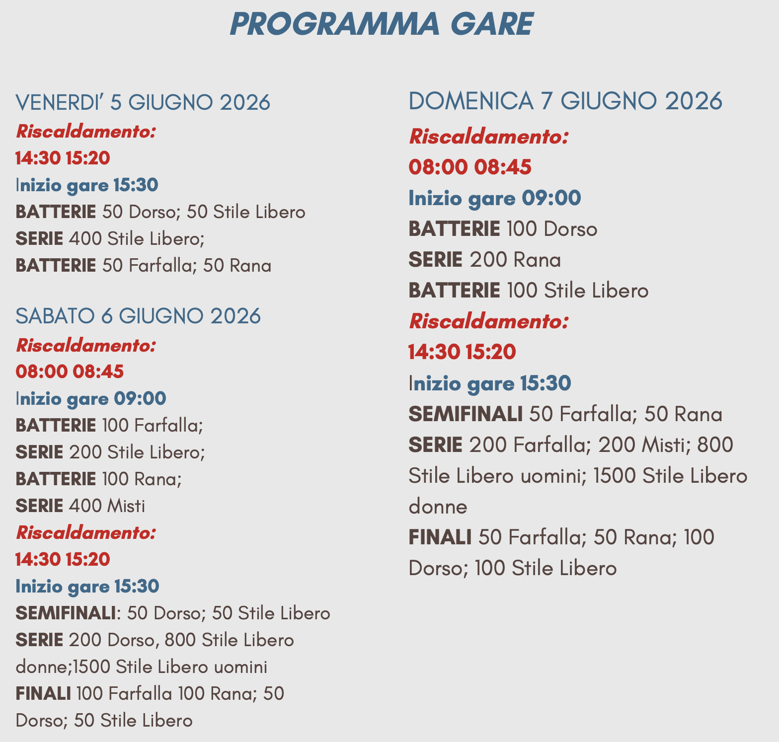 L’evento si svolgerà venerdi 5, sabato 6 e domenica 7 giugno 2026 presso il Centro Federale “Daniela Samuele” di Milano, in via Trani angolo Mecenate. Le gare avranno luogo in una vasca olimpica da 50 metri a 8 corsie, dotata di blocchi di nuova generazione e device per le partenze a dorso, con cronometraggio automatico a doppia piastra a cura della Federazione Italiana Cronometristi. Per tutta la durata della manifestazione sarà inoltre disponibile una vasca da 25 metri per riscaldamento e defaticamento.
