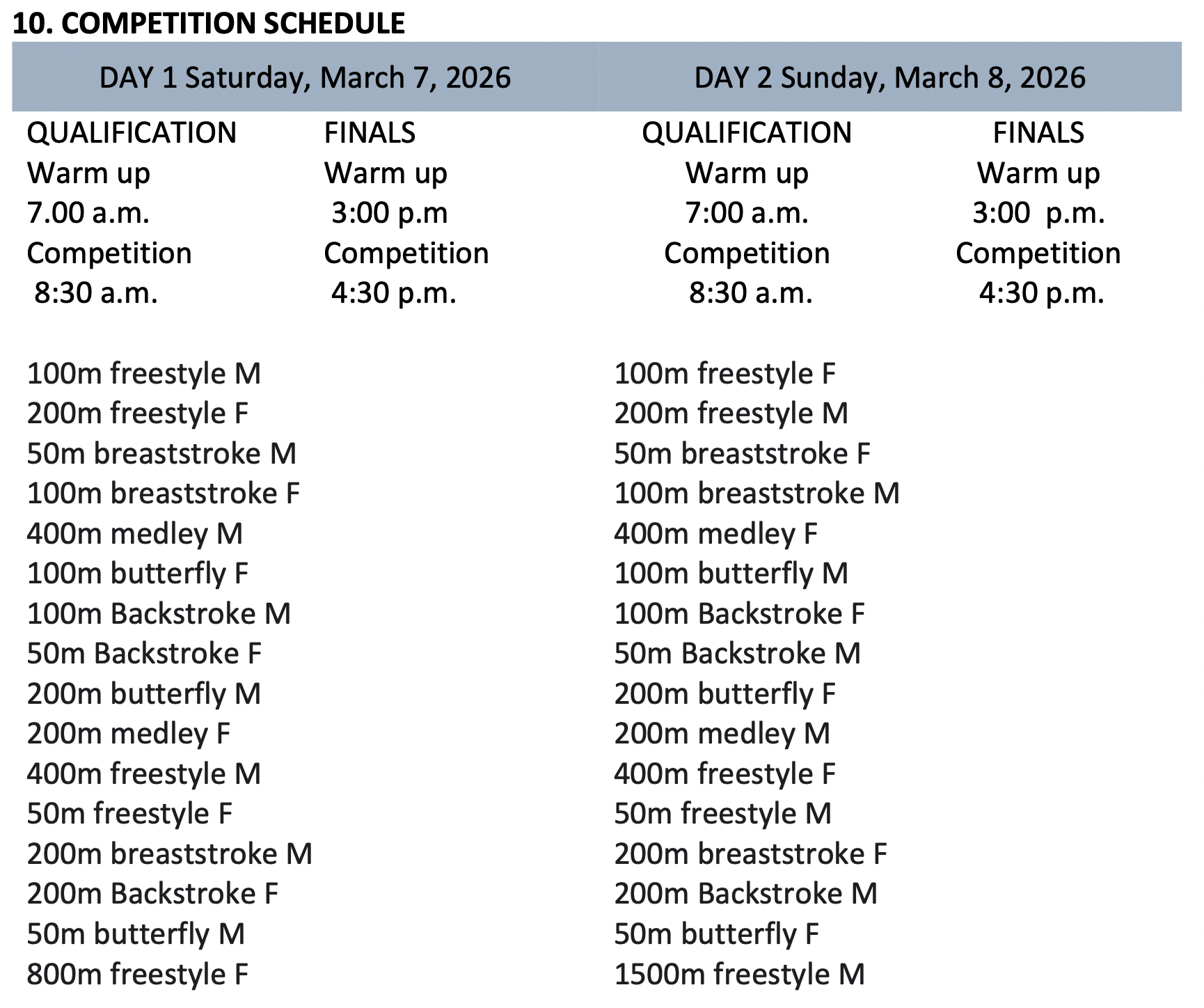 L’evento prevede batterie al mattino e finali al pomeriggio, con tutte le gare dai 50 ai 200 metri suddivise in finali A, B e C. Le prove dei 400, 800 e 1500 stile libero e dei 400 misti si disputano come finali dirette, con la serie più veloce programmata nel pomeriggio.