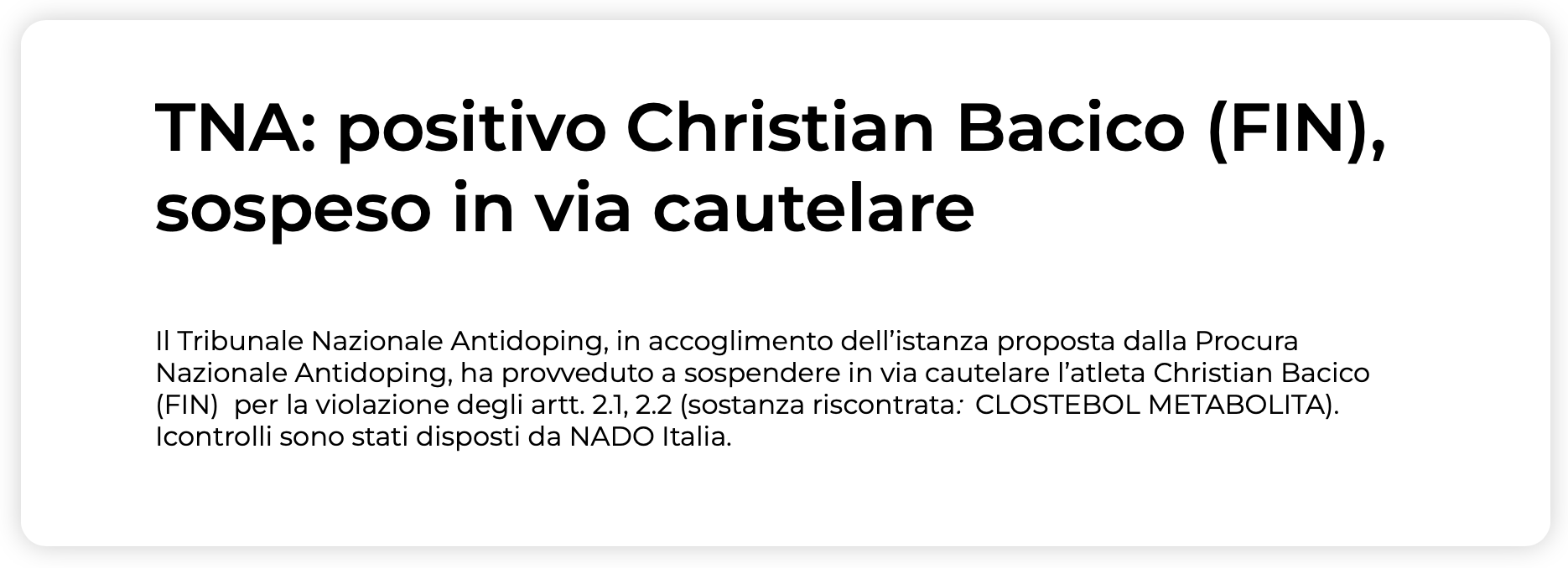 NADO Italia comunica che il Tribunale Nazionale Antidoping (TNA), in accoglimento dell’istanza presentata dalla Procura Nazionale Antidoping, ha disposto la sospensione cautelare dell’atleta Christian Bacico. Il provvedimento è stato adottato per la violazione degli articoli 2.1 e 2.2 delle Norme Sportive Antidoping, a seguito della positività al Clostebol (metabolita) riscontrata in un controllo antidoping disposto da NADO Italia.