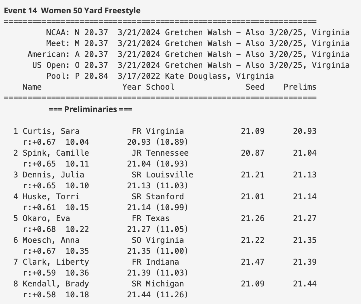 Nel corso delle batterie della terza giornata di gare dei Campionati NCAA Division I, in corso ad Atlanta, l'azzurra Sara Curtis nuota il miglior tempo unica atleta a scendere sotto i 21 secondi, (20.93). Le finali nella notte italiana. L'atleta piemontese rientrerà in Italia nelle prossime settimana per prendere parte ai Campionati Assoluti Primaverili di Riccione.