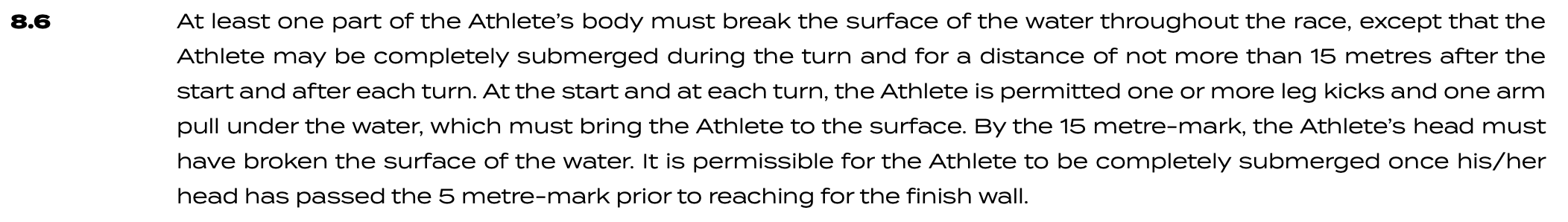 (STILE LIBERO) È consentito che l’atleta sia completamente immerso una volta che la sua testa abbia superato il limite dei 5 metri prima di allungarsi verso la parete d’arrivo.