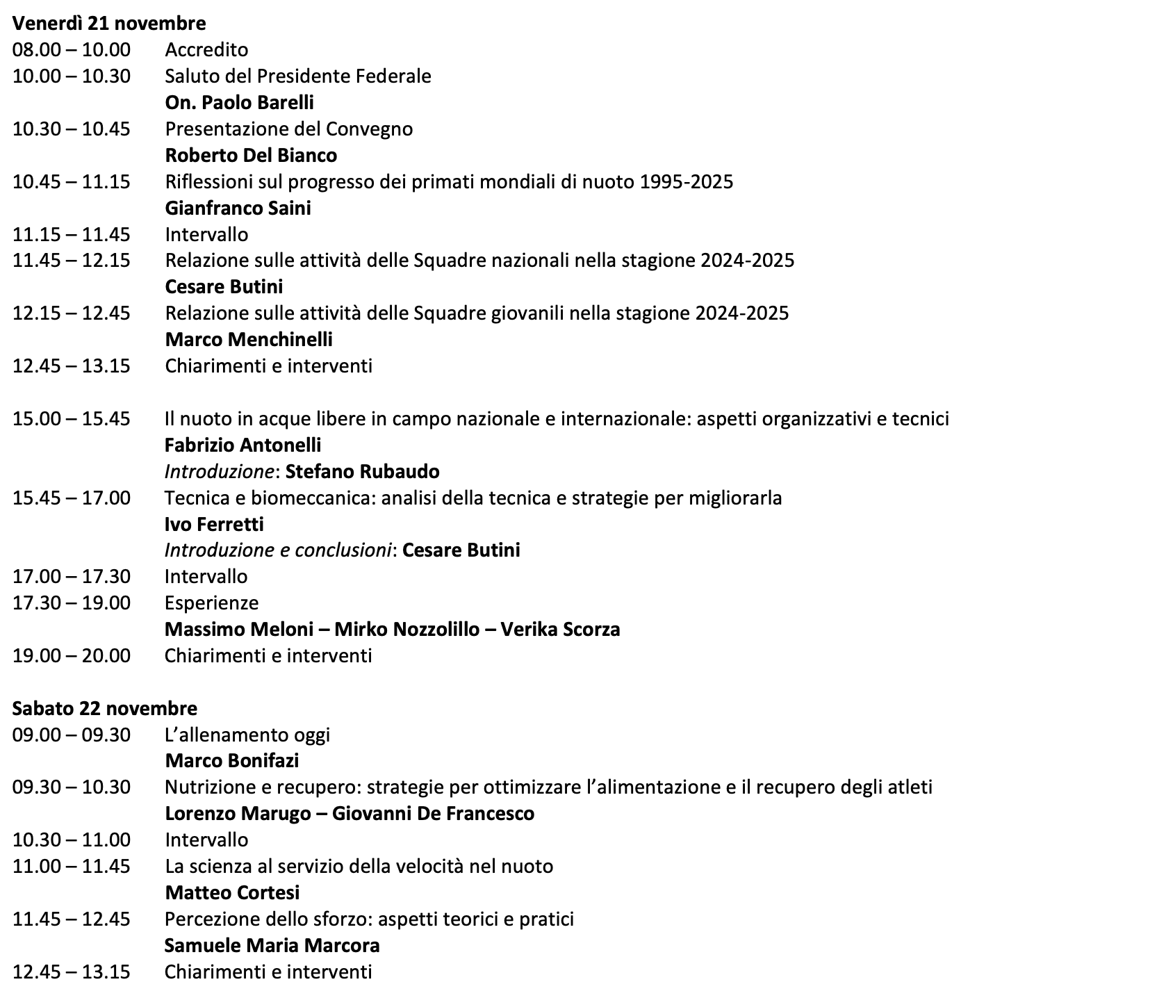 Il 21 e 22 novembre 2025 Chianciano Terme ospiterà il Convegno allenatori di nuoto presso l’Hotel Excelsior, nella Sala Lorenzo il Magnifico. Due giornate dedicate alla formazione e al confronto tra tecnici, promosse dalla Federazione Italiana Nuoto attraverso l’Area Formazione – Settore Istruzione Tecnica. In allegato qui sopra il programma.