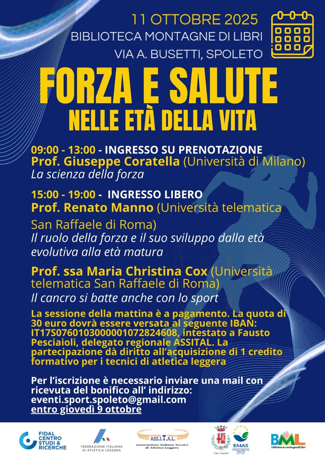 La sessione mattutina, dalle ore 9 alle 13, con ingresso su prenotazione e una quota di partecipazione di 30 euro, vedrà come relatore il professor Giuseppe Coratella dell’Università di Milano, che approfondirà il tema “La scienza della forza”. La partecipazione a questo modulo darà diritto a 1 credito formativo per i tecnici di atletica leggera. Per iscriversi è necessario inviare entro giovedì 9 ottobre la ricevuta del bonifico all’indirizzo mail eventi.sport.spoleto@gmail.com.