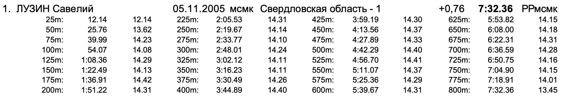 - 800 SL U - Savely Luzin 7:32.36 - NR