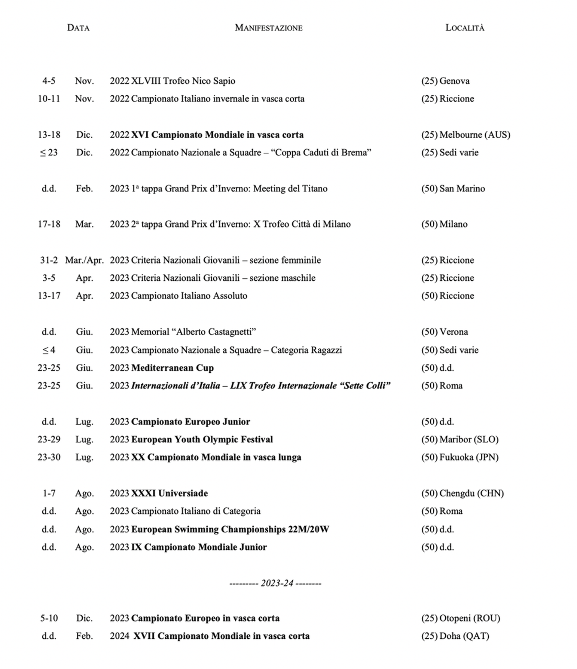 La circolare federale contiene il calendario nazionale, le scadenze, i requisiti di ammissione per il Campionato Italiano in vasca corta 2022 e il nuovo regolamento del Campionato Italiano a Squadre 2022-23.