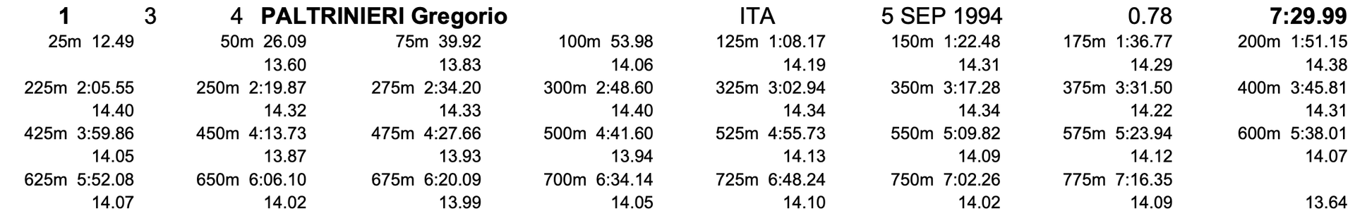 Gregorio Paltrinieri risolve la pratica degli 800 stile libero con sicurezza e grande consapevolezza nella sua gestione di gara, oramai diventata imprevedibile, oggi nuota la distanza in negative split ed ottiene un computo finale di 7.29.99 (3.45.81). Greg vincente e convincente conquista il suo secondo oro individuale puntando al nuovo avversario in vasca corta irlandese Daniel Wiffen che l'altro ieri a Dublino gli ha tolto il primato europeo della specialità (7.25.96). La vittoria odierna è la ciliegina sulla torta ad un suo 2022 a dir poco straordinario in cui ha vinto in ogni dove.