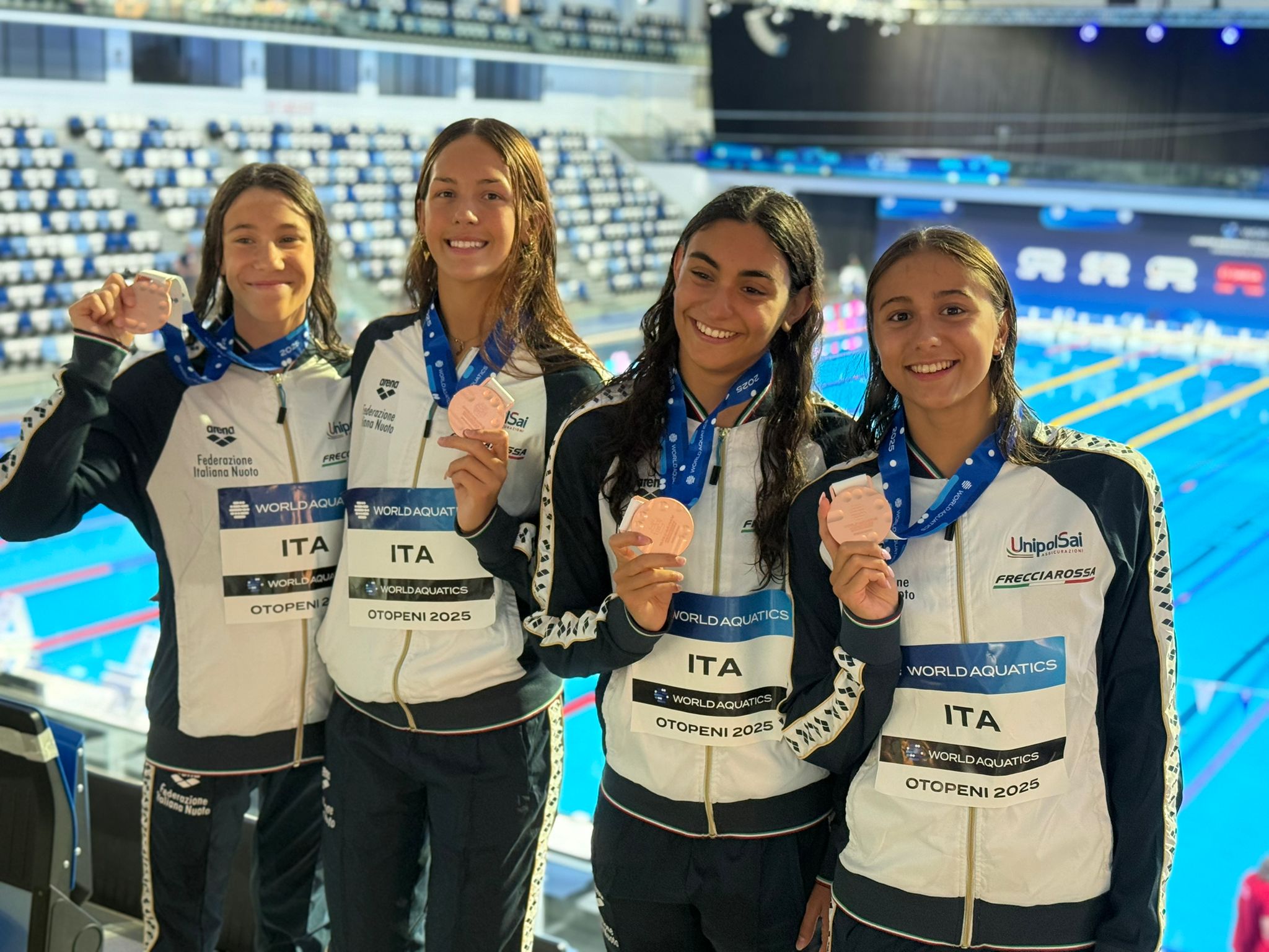 La nostra staffetta 4X200 femminile, formazione primatista europea juniores, chiude la finale mondiale di Otopeni al terzo posto con il tempo di 7:56.86, alle spalle della Cina (7:51.59) e degli Stati Uniti (7:52.82). Le azzurre hanno costruito il bronzo con una prova d'insieme di grande equilibrio: Bianca Nannucci apre in 1:59.67, seguita da Lucrezia Domina (1:58.75) e Chiara Sama (1:58.72), segue la chiusura della giovane Alessandra Mao in 1:59.72. Tutte le frazioni sotto i due minuti testimoniano la compattezza del nostro quartetto, elemento che ha permesso all’Italia di garantirsi un pregiatissimo podio mondiale juniores e di mantenere la leadership continentale conquistata ai recenti Europei Juniores di Samorin.