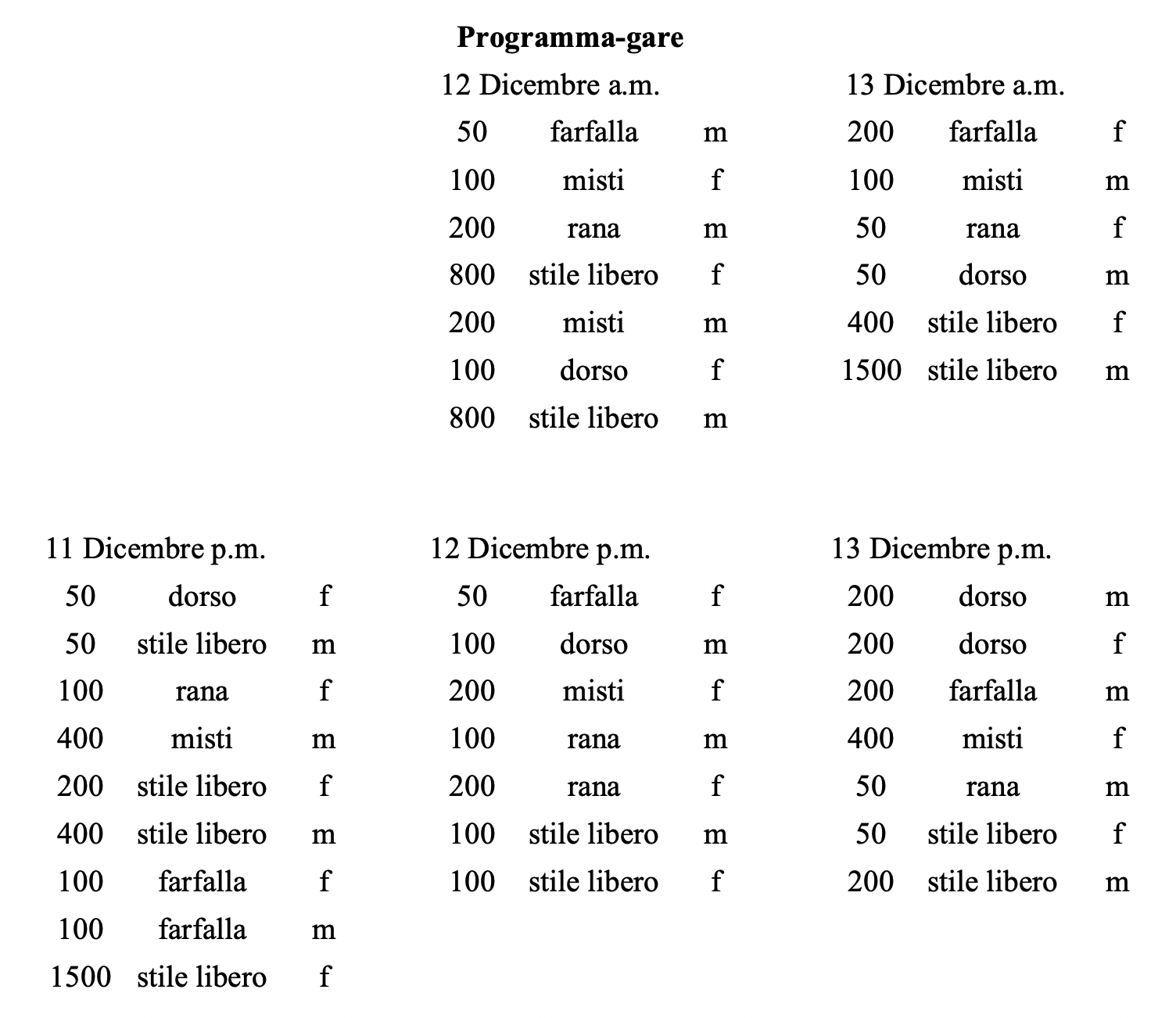 La Federazione Italiana Nuoto ha ufficializzato date, programma, tempi limite e formula del Campionato Italiano Assoluto Open-Frecciarossa 2025, che si terrà a Riccione, in vasca da 25 metri, dall’11 al 13 dicembre 2025. La manifestazione si articolerà in cinque sessioni di gara, con formula a serie, qui sopra il link al documento FIN.