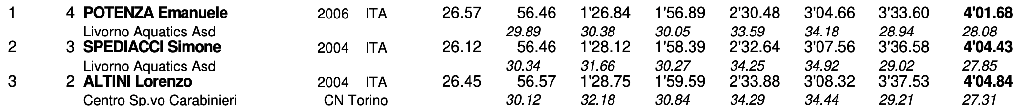 Il 20enne pugliese Emanuele Potenza (Livorno Aquatics) soprende tutti siglando l'undicesimo crono di ogni epoca di questa specialità (4’01”68), non sono da meno il suo compagno di squadra Simone Spediacci (Livorno Aquatics) e Lorenzo Altini (Centro Sp.vo Carabinieri / CN Torino), entrambi siglano il loro nuovo primato personale; 4.04.43 e 4.04.83.