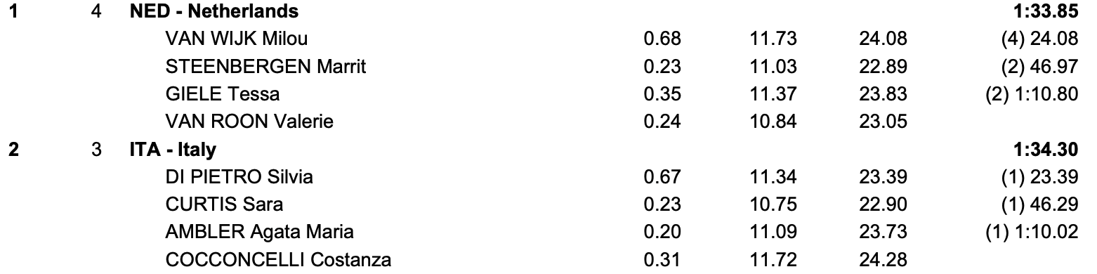 La staffetta veloce femminile sfiora l'impresa d'oro, ma solo per oggi si ferma al capolavoro d'argento con due nuovi primati italiani. L'esperta sprinter romana Silvia Di Pietro (Carabinieri / CC Aniene) apre le danze della velocità con un formidabile 23"39, migliorando il suo precedente record nazionale di 23"68. Segue un’ottima seconda frazione di Sara Curtis (Esercito / CS Roero) che nuota sotto i 23 secondi (22"90), seconda migliore prestazione lanciata della finale, poi è il turno di Agata Maria Ambler (Team Veneto) con 23"73, ed in ultima frazione chiude Costanza Cocconcelli con 24"28, un parziale non sufficiente a contenere il rientro delll’olandese Valerie Van Roon (23"05) che porta al titolo europeo i Paesi Bassi in 1'33"85. Per l’Italia un argento pregiatissimo con il nuovo primato nazionale (1'34"30); il precedente limite, 1'35"61, risaliva al 2016.