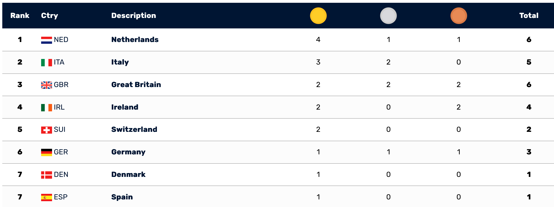 L'italia molla la testa del medagliere per nazioni a favore dell'Olanda di Marrit Steenbergen.