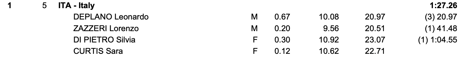 L’Italia domina la 4x50 stile libero mixed firmando un nuovo, strepitoso e storico record mondiale (1:27.26), miglioriamo il precedente primato iridato dei francesi di sette centesimi. Gli azzurri costruiscono il loro capolavoro con un crescendo di frazione in frazione: Leonardo Deplano (Carabinieri / CC Aniene) apre in 20.97 mantenendo il quartetto in piena corsa per il titolo; Lorenzo Zazzeri (Esercito / RN Florentia) guadagna spazio, Silvia Di Pietro (Carabinieri / CC Aniene) consolida il margine sugli avversari e Sara Curtis (Esercito / CS Roero) chiude con un fulmineo 22.71, che non solo mette in cassaforte il titolo europeo, ma consegna alla storia del nuoto italiano il primato mondiale della specialità. Alle loro spalle si piazzano Ungheria (1:28.04) e Paesi Bassi (1:28.42).