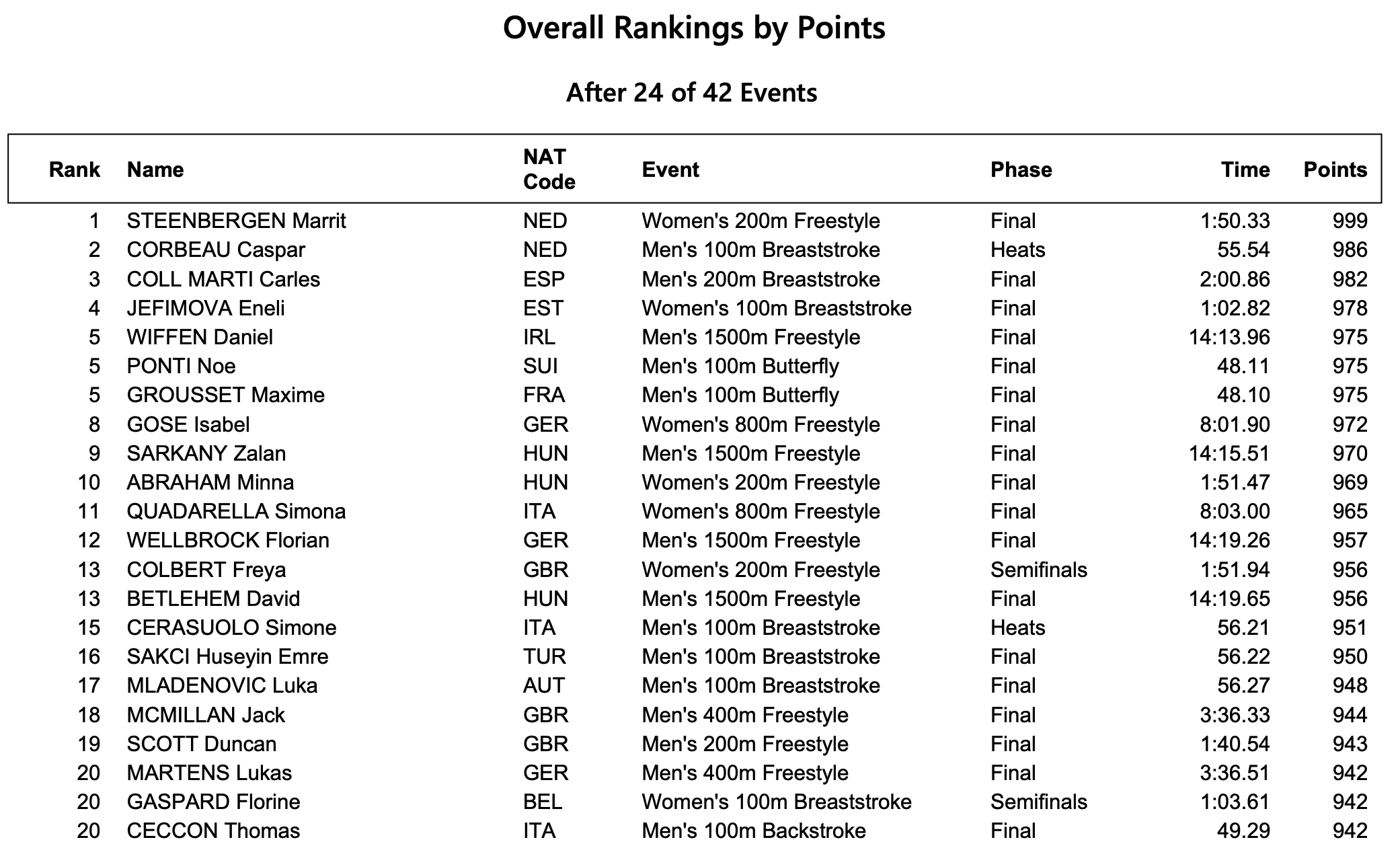 Al termine della quarta giornata di gare dei XXIII Campionati Europei di Nuoto in vasca corta 2025, di scena a Lublino (Polonia) all’interno del complesso natatorio Aqua Lublin, l'Italia è seconda nel medagliere per nazioni dietro all'Olanda. Al momento la migliore prestazione tecnica è stata nuotata dall'olandese Marrit Steenbergen che ha siglato il primato europeo nei 200 stile libero (1.50.33), segue la TOP20.