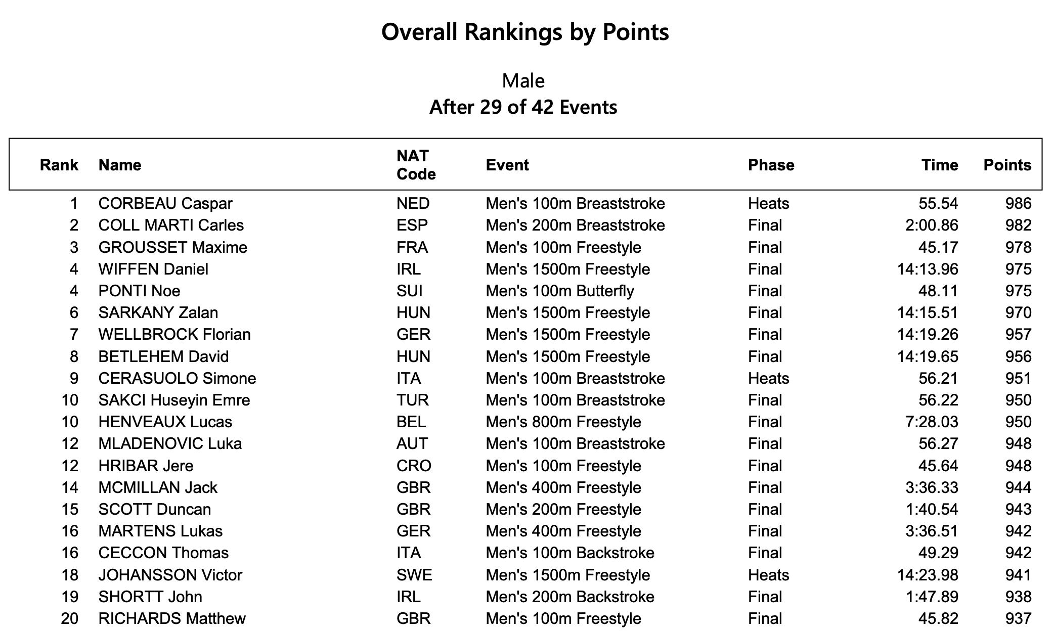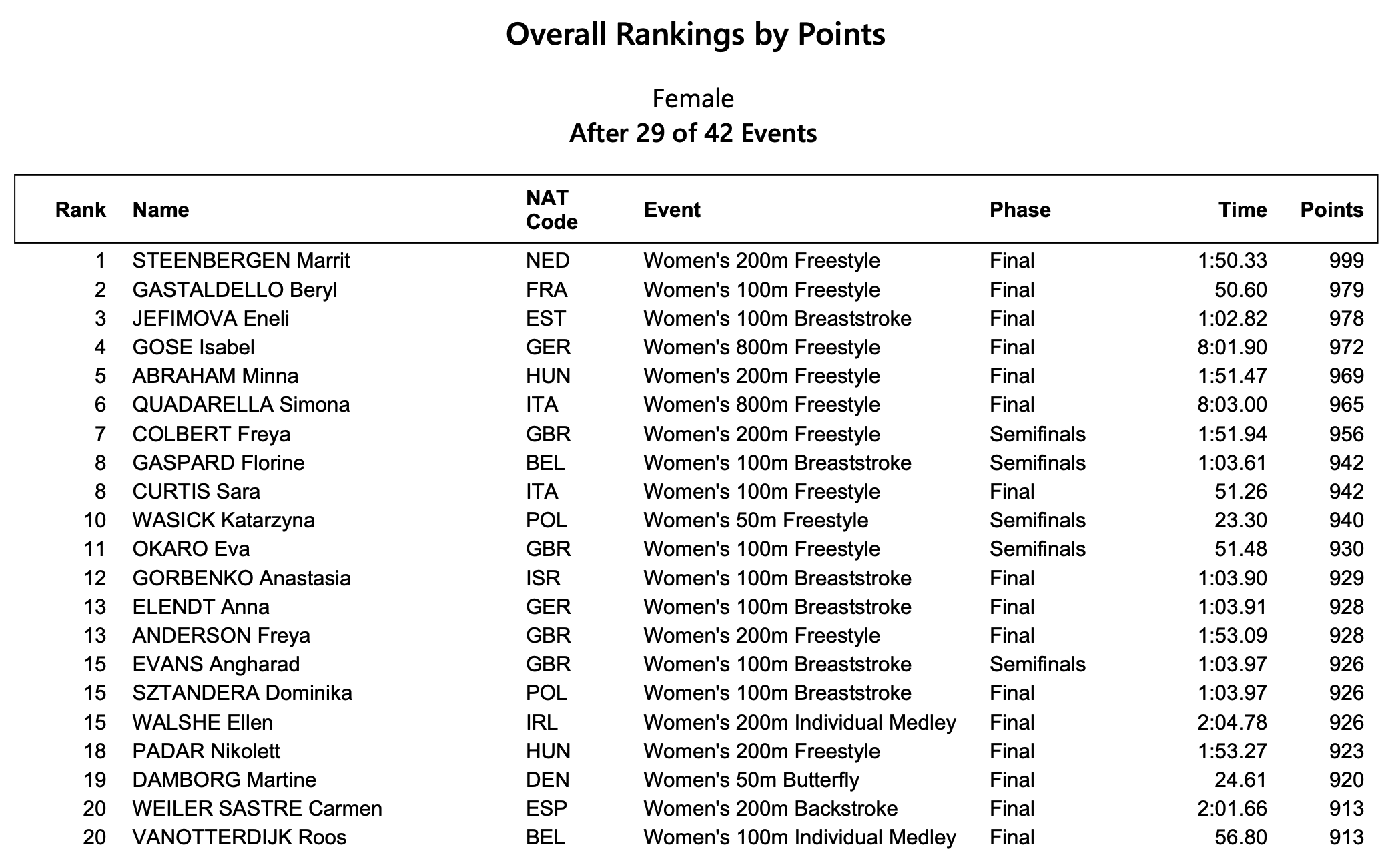 Italia (4-4-2) sempre seconda nel medagliere per nazionI alle spalle dell'Olanda di Marrit Steenbergen (5 ori - 4 primati europei), seguono la Gran Bretagna e la Germania, oggi l'epilogo con l'assegnazione degli ultimi 13 titoli continentali. Entrambe olandesi le migliori prestazioni tecniche di genere, Marrit Steenbergen nei 200 stile libero (1.50.33) e il connazionale Caspar Corbeau nei 100 rana (55.54).