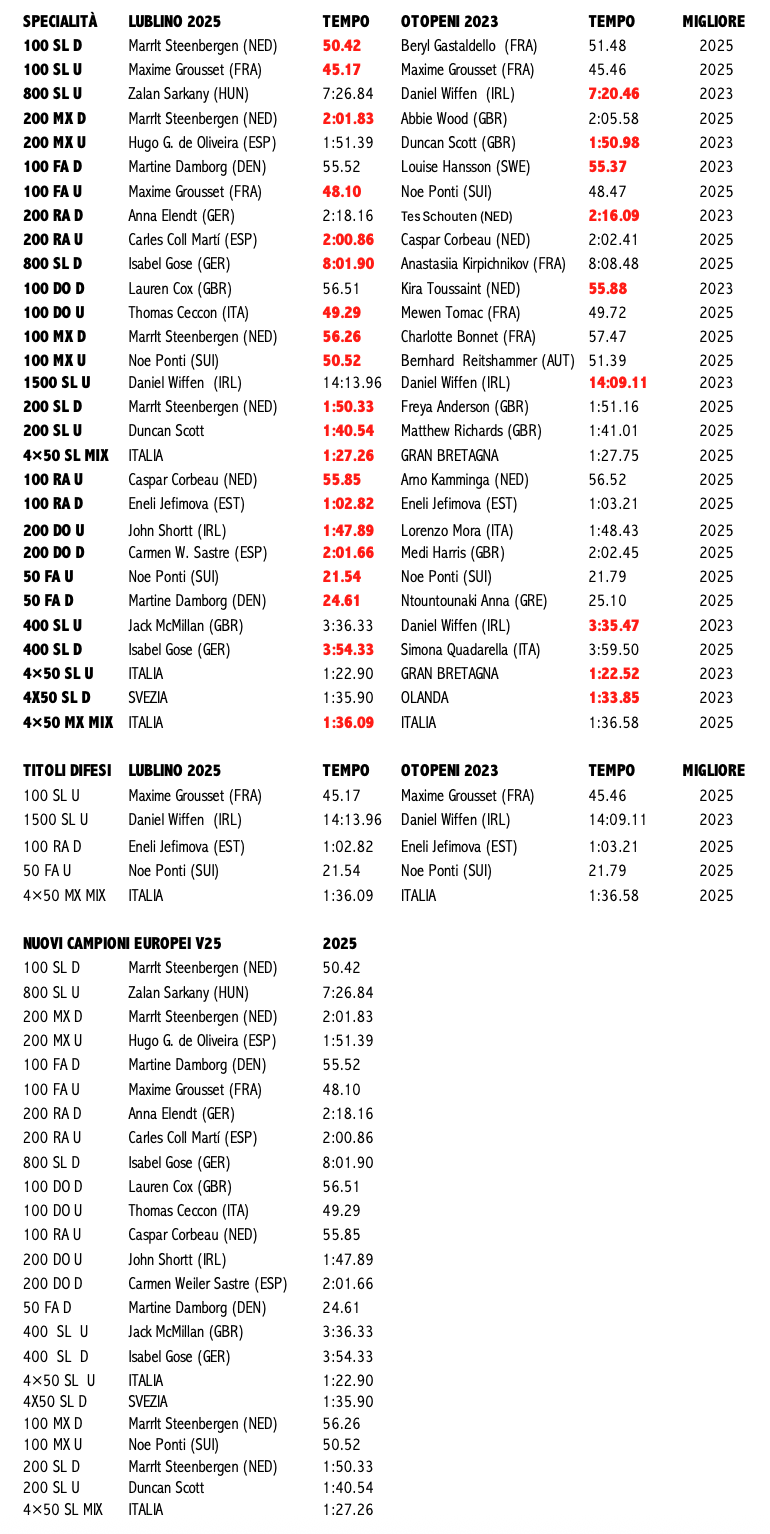 Segue il confronto tra i tempi dei vincitori dei correnti Campionati Europei di Nuoto in vasca corta 2025 di Lublino con quelli della precedente edizione di Otopeni 2023.
