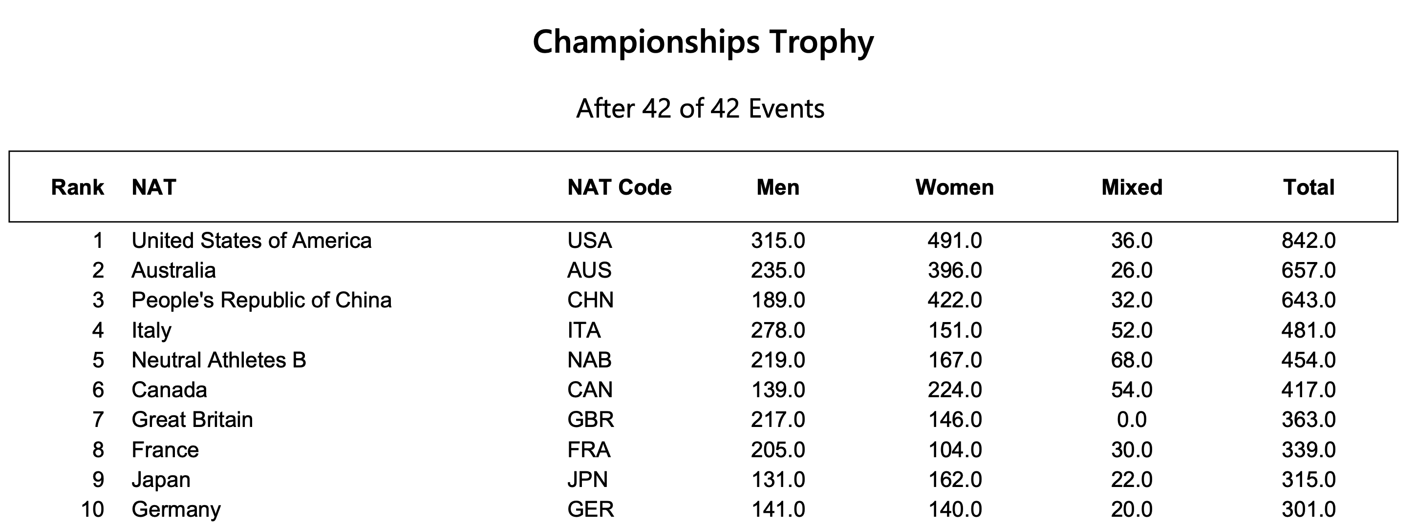 Il bilancio tecnico registra 2 primati europei, 10 record italiani e 7 record di categoria, oltre al 4º posto nella classifica a punti del Championships Trophy, con un brillante 2º posto tra gli uomini e il 6º tra le donne, mentre nel medagliere per nazioni l’Italia si è piazzata al 10º posto.