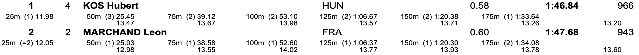 - 200 Dorso Uomini - Hubert Kos (HUN) – 1:46.84, Leon Marchand (FRA) – 1:47.68