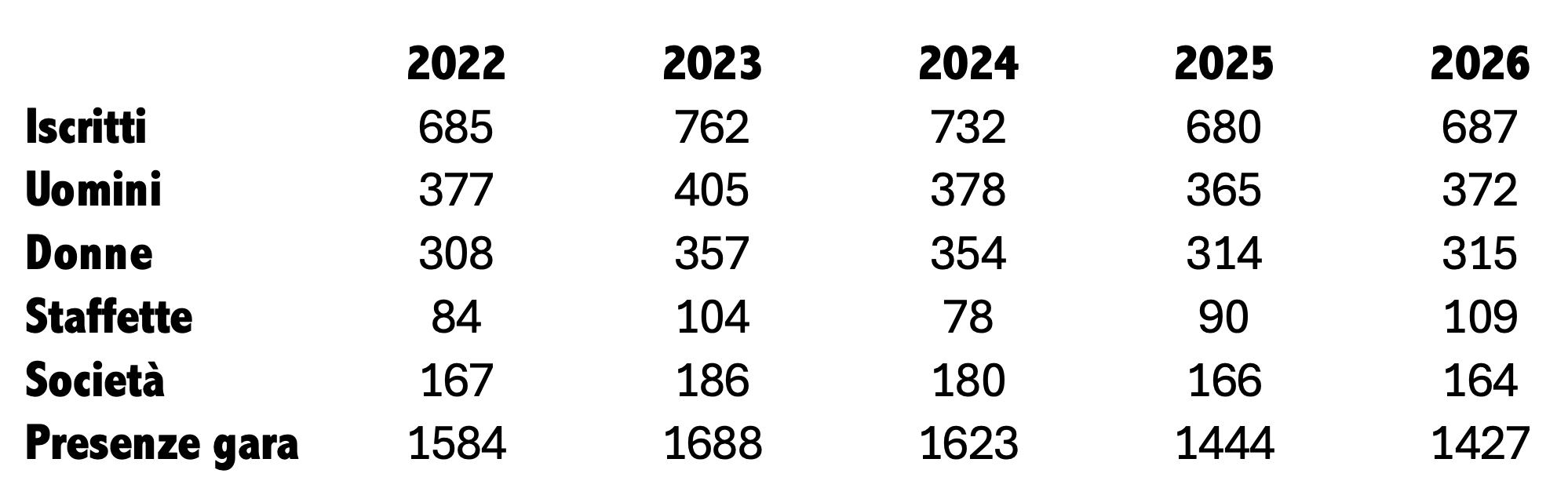 372 nuotatori e 315 nuotatrici di 164 club per un totale di 1.427 presenze-gara e 109 formazioni di staffetta.