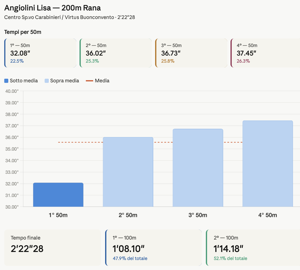 È disponibile l'analisi di gara (PDF), a cura di MP Swimming Analisys di Matteo Poli, del primato italiano 200 rana (2.22.28) ottenuto da Lisa Angiolini (Centro Sp.vo Carabinieri – Virtus Buonconvento) nel corso della seconda giornata di gare dei Campionati Assoluti Unipol in corso di svolgimento allo Stadio del nuoto di Riccione.