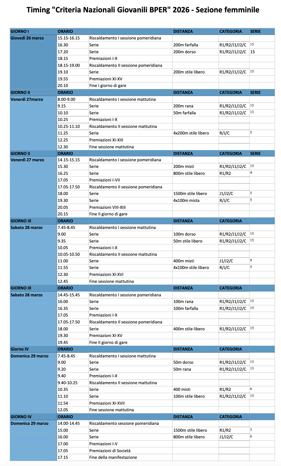 Federnuoto ha pubblicato l'elenco ammessi definitivo (Femminile-Maschile) ai Criteria Nazionali Giovanili BPER 2026, sono disponibili anche le avvertenze del settore femminile, con l'ordine progressivo delle gare, la distribuzione delle prove ed il timing.