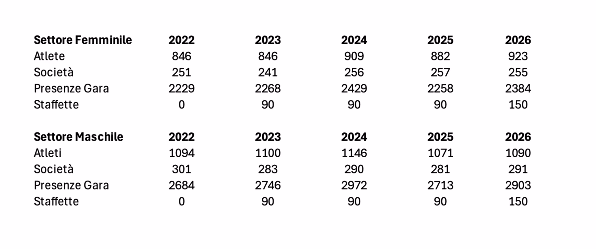 Per il settore femminile saranno in gara allo Stadio del nuoto di Riccione 923 atlete di 255 club per un totale di 2.384 presenza gara, per quello maschile 1.090 atleti di 291 club per un totale di 2903 presenze gara, segue il confronto con i numeri delle ultime cinque edizioni.