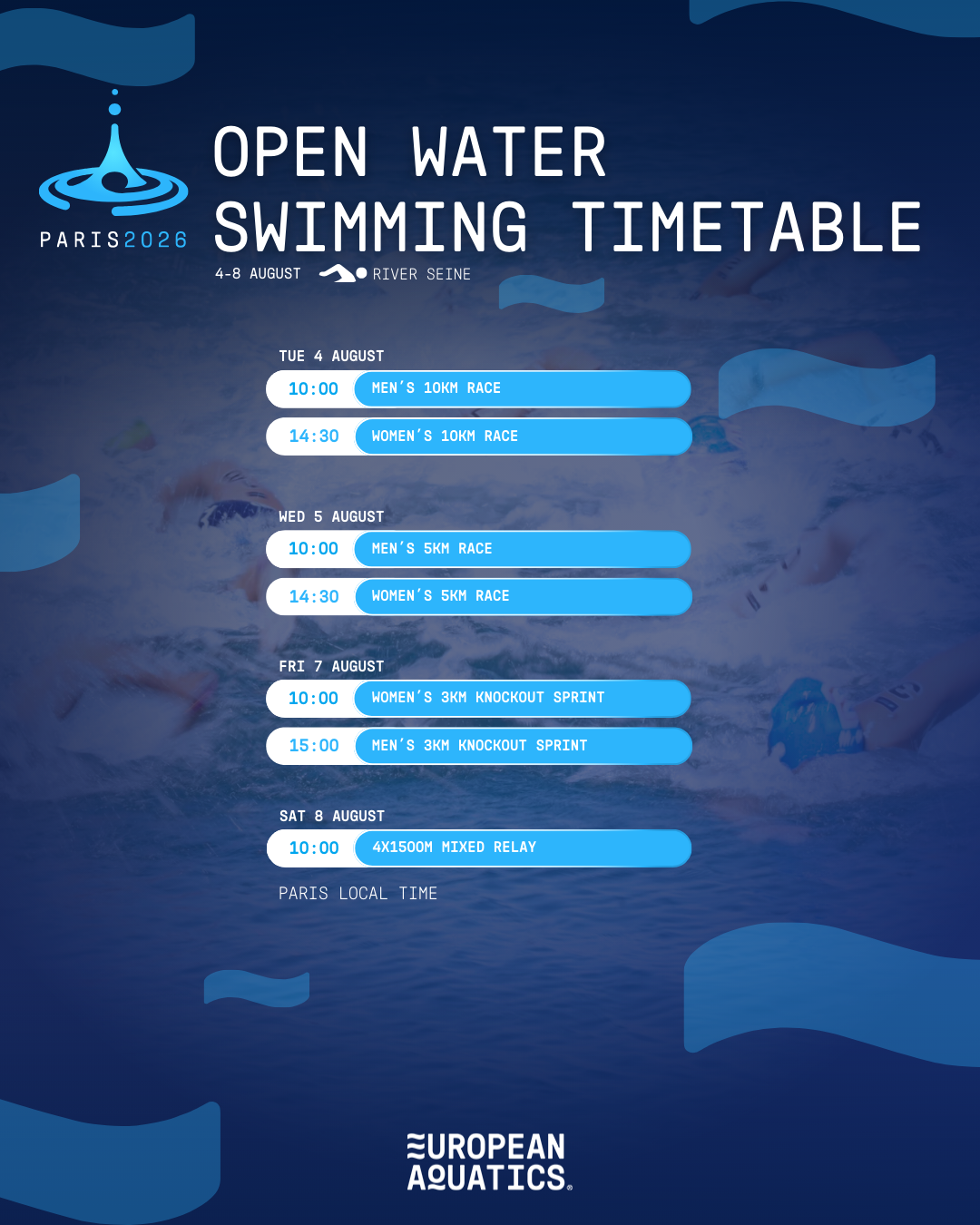 Campionati Europei 2026 di Parigi (OPEN WATER) - Timetable da European Aquatics