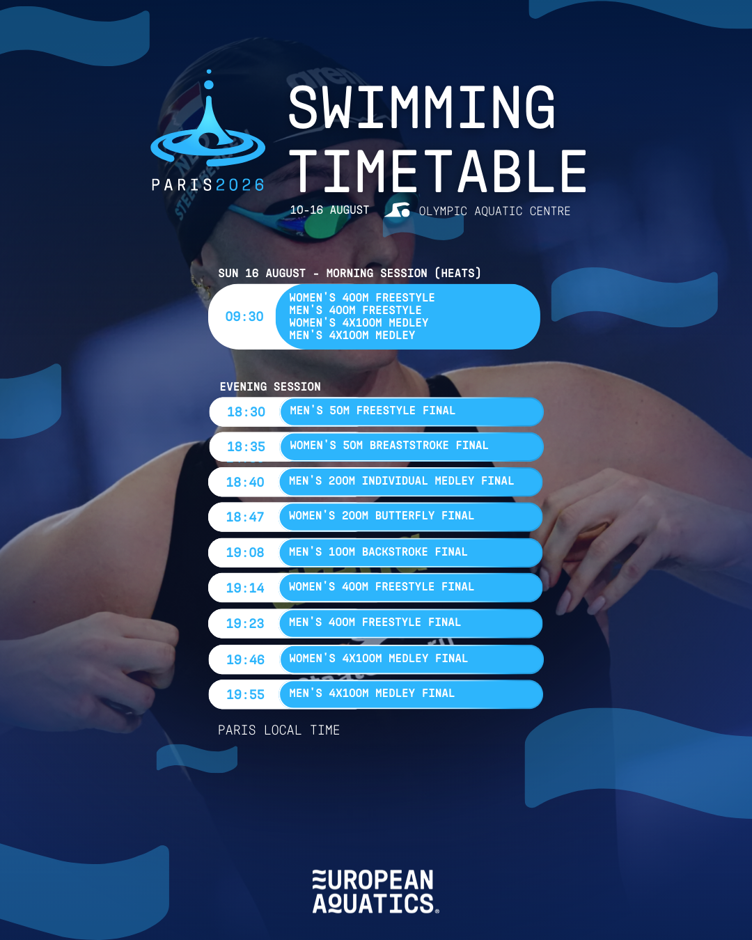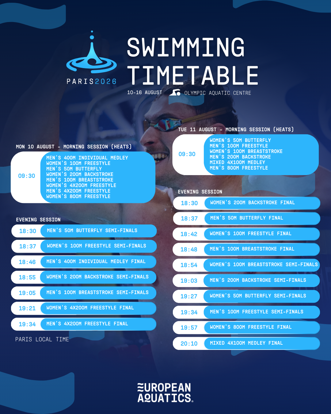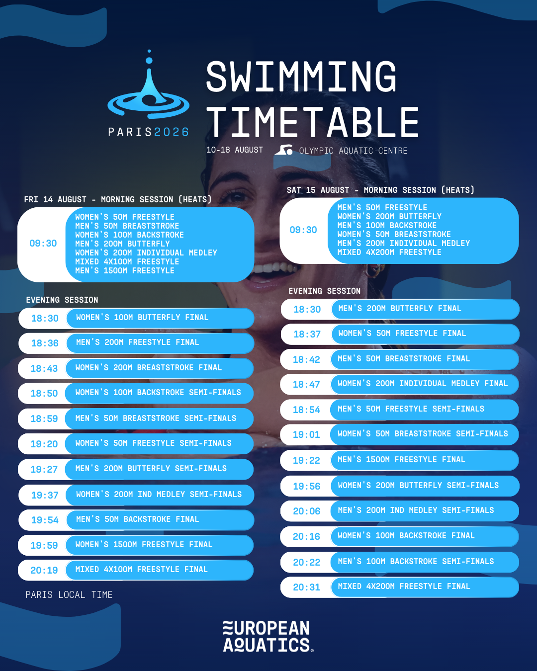 European Aquatics e il comitato organizzatore della 38ª edizione dei Campionati Europei di Nuoto di Parigi 2026 hanno pubblicato il timing delle gare giorno per giorno. Sette giornate di competizione per il nuoto, dal 10 al 16 agosto presso l'Olympic Aquatic Centre (impianto olimpico di Parigi 2024), con batterie di qualificazione dalle 9.30 e semifinali e finali pomeridiane dalle 18.30, nove finali in programma nell'ultimo pomeriggio di gare. Acque libere prima del nuoto, dal 4 all'8 agosto nel campo gara della Senna.