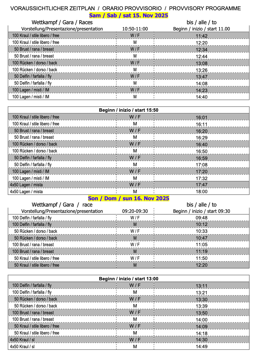 Le gare si disputeranno sabato dalle 16:30 alle 18:30 e domenica dalle 13:30 alle 15:15, con le tre serie più veloci per ciascuna distanza (50 e 100 metri). Sono iscritti 585 atleti di 47 società provenienti da 12 paesi diversi. Lo Swimmeeting Alto Adige sarà nuovamente un Green Event.
