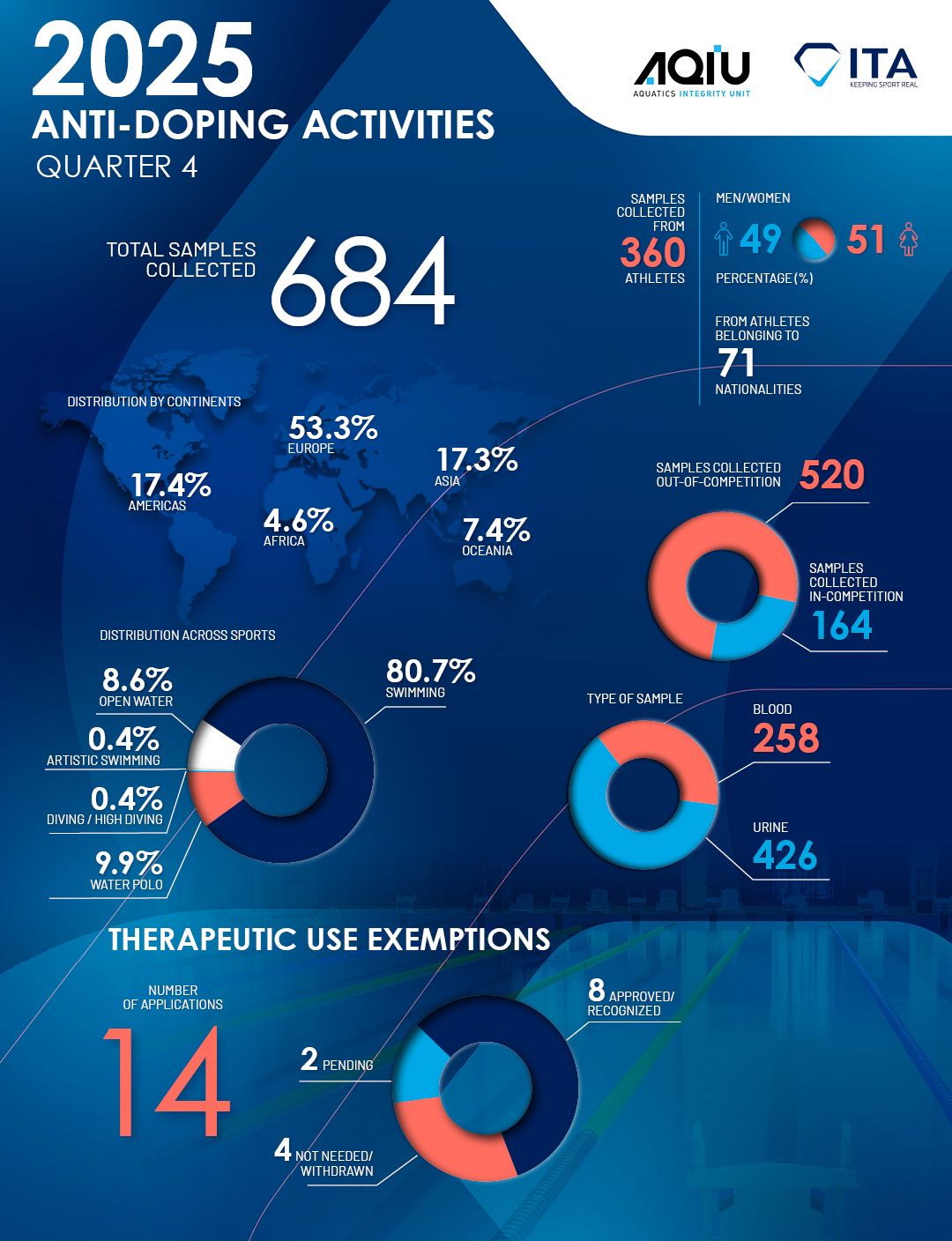 L’Aquatics Integrity Unit ha pubblicato i dati antidoping del quarto trimestre 2025. L’International Testing Agency (ITA), che gestisce il programma antidoping di World Aquatics, ha raccolto 684 controlli antidoping su 360 atleti di 71 nazioni, quasi il 90% dei test riguardano nuotatori di vasca e di acque libere, l'Europa rimane di gran lunga il continente più testato del mondo.