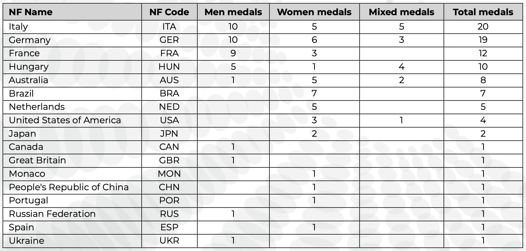 Nel complesso, l’Europa ha confermato la propria leadership con Germania e Italia protagoniste, ma l’ascesa del Giappone dimostra un panorama sempre più globale e competitivo. L'italia risulta la nazione più vincente nel computo delle medaglie vinte nelle ultime cinque edizioni.