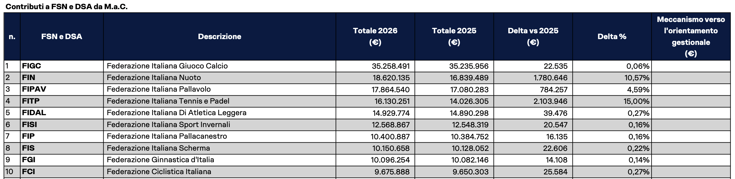In questo quadro, la Federazione Italiana Nuoto risulta la seconda Federazione per entità del contributo ricevuto, preceduta solo dalla FIGC, con un incremento del 10,57% rispetto al 2025, a conferma del peso strutturale del movimento acquatico nel sistema sportivo nazionale.