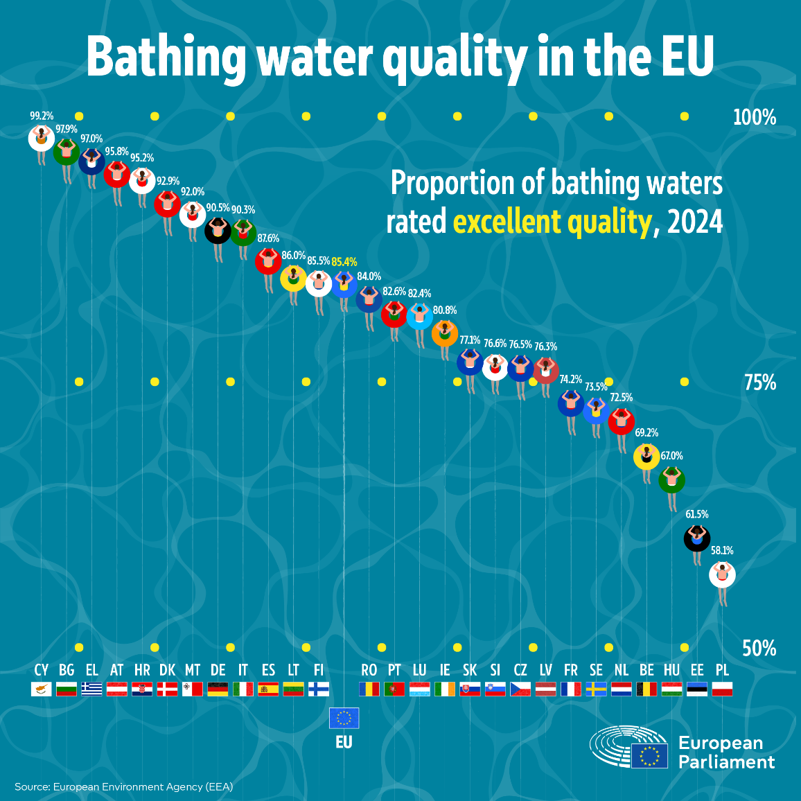 I Paesi con la più alta percentuale di acque eccellenti (oltre il 95%) sono Cipro (99,2%), Bulgaria (97,9%), Grecia (97%), Austria (95,8%) e Croazia (95,2%), l’Italia si colloca nella fascia alta della classifica, ma non ai primissimi posti. Le percentuali più basse si registrano invece in Belgio (69,2%), Ungheria (67%), Estonia (61,5%) e Polonia (58,1%). In sintesi, l’Europa si conferma un luogo dove nuotare in sicurezza: quasi tutte le acque di balneazione sono pulite e prive di inquinanti nocivi per la salute e l’ambiente.