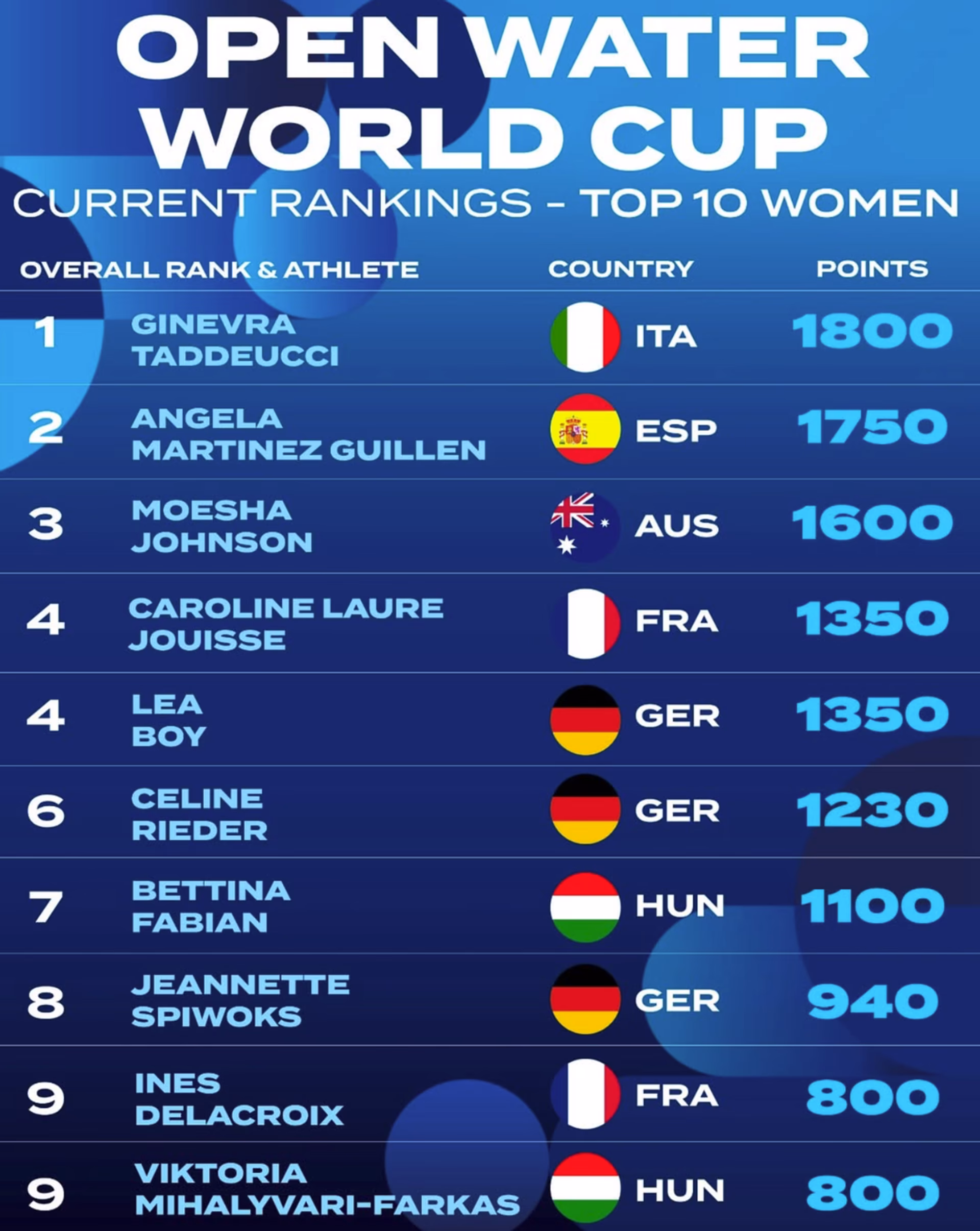 L’Italia si presenta a Golfo Aranci con 32 atleti: tra le protagoniste spicca la medaglia olimpica Ginevra Taddeucci, leader della classifica generale con 1800 punti. In campo maschile domina il francese Marc-Antoine Olivier (1950), ma Andrea Filadelli e Dario Verani (1450) restano in piena corsa grazie agli 800 punti messi in palio per il vincitore. La tappa segna anche l’assenza di Gregorio Paltrinieri, il debutto nelle acque libere di Gabriele Detti e il ritorno del neo papà Domenico Acerenza, rientrato dopo l’operazione alla spalla che lo aveva tenuto lontano dalle gare.
