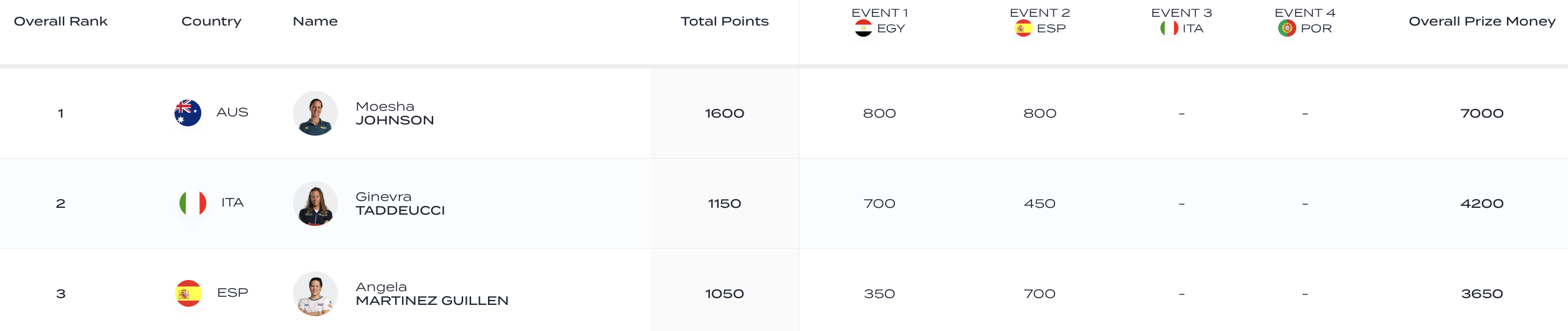 Al femminile, come già accaduto nella prima tappa di Soma Bay, si impone l’australiana Moesha Johnson in 1h58’51”3. Seconda la spagnola Angela Martinez Guillen (1h58’56”63), terza l’ungherese Viktoria Mihalyvari-Farkas (1h59’01”3). Sesta l’azzurra Ginevra Taddeucci con 1h59’41”6.