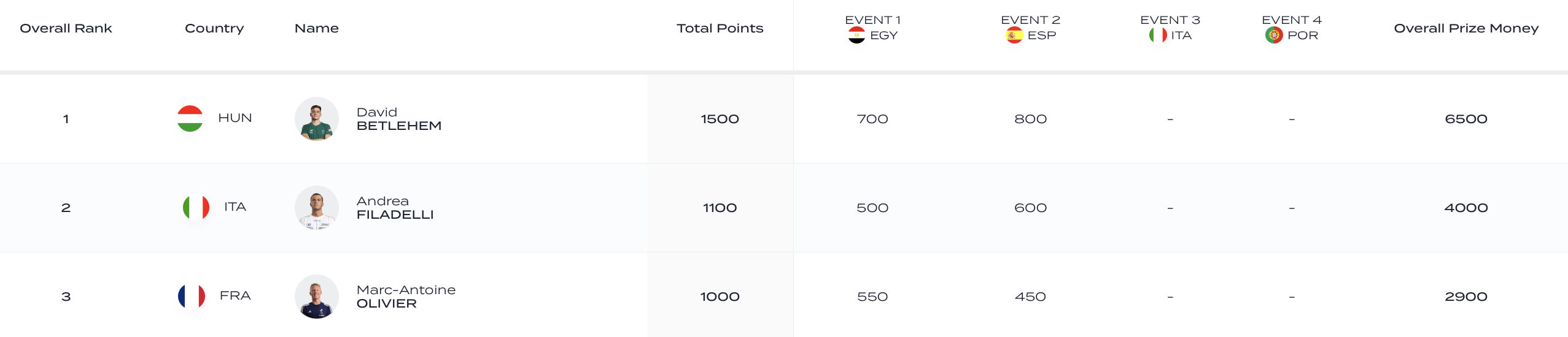 Terzo posto per l’azzurro Andrea Filadelli, già vincitore della tappa nel 2025, oggi copre la distanza in 1h52’45”0 e sale al secondo posto nella classficia del circuito. Il successo pieno va all’ungherese David Betlehem, bronzo olimpico, primo in 1h52’39”9, davanti al francese Sacha Velly (1h52’44”2). Ai piedi del podio Marcello Guidi (1h52’47”9) seguito da Pasquale Giordano (1h52’51”0).