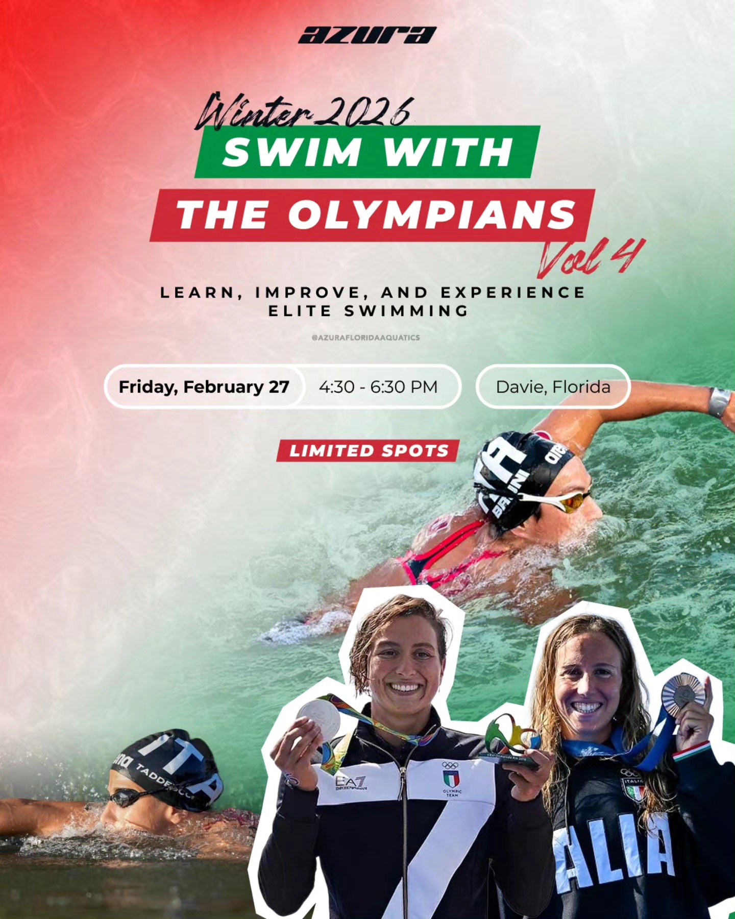 Il prossimo 27 febbraio, le medagliate olimpiche Rachele Bruni (argento olimpico Rio 2026) e Ginevra Taddeucci (bronzo olimpico Parigi 2024) saranno ospiti d’onore del clinic “"Swim With The Olympians", organizzato da Azura Florida Aquatics presso la NSU di Davie (Florida).