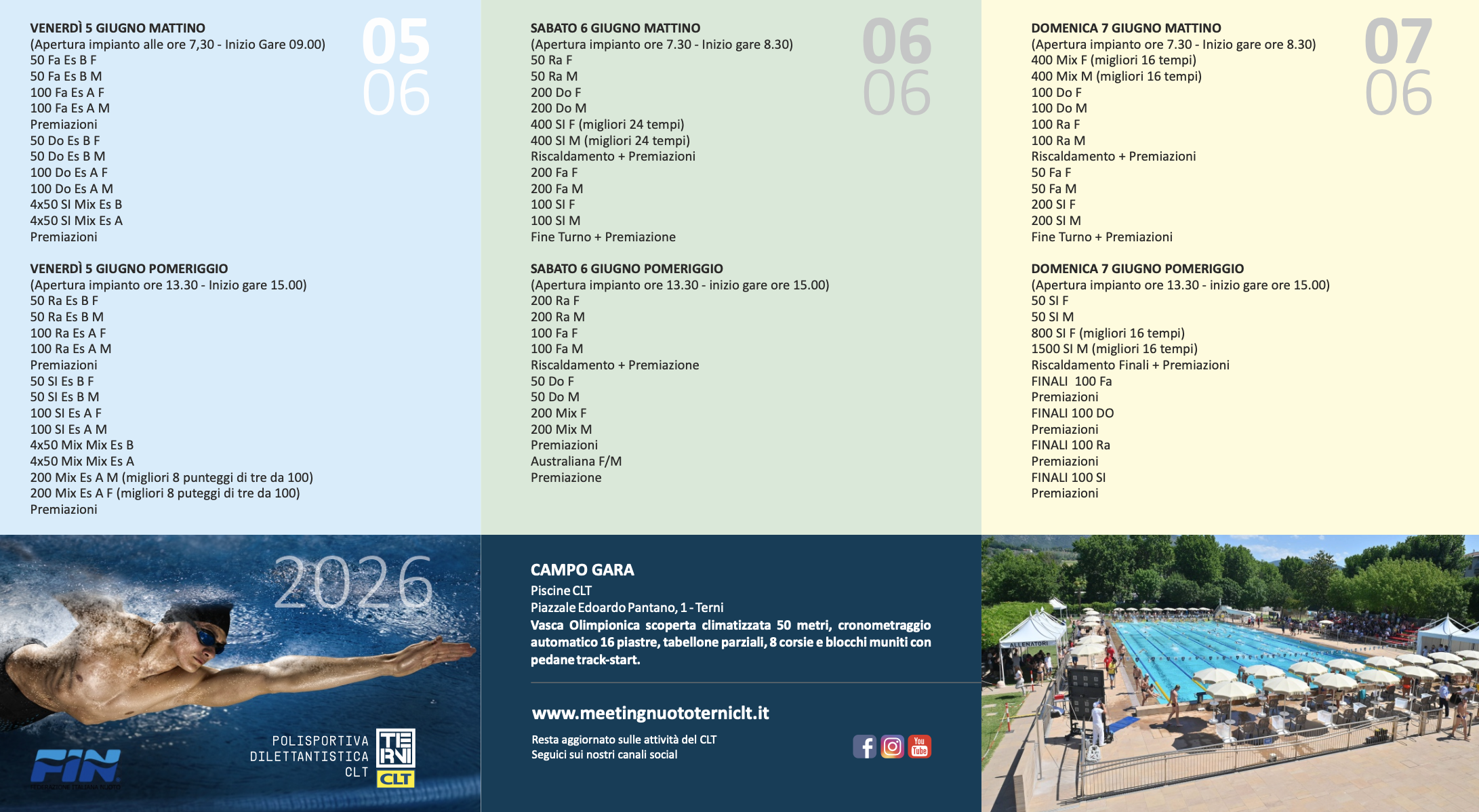 Dal 5 al 7 giugno si svolgerà “Acciaio – 5° Meeting Nazionale Città di Terni”, con organizzazione a cura della Polisportiva Circolo Lavoro Terni, in vasca lunga outdoor presso le piscine CLT.