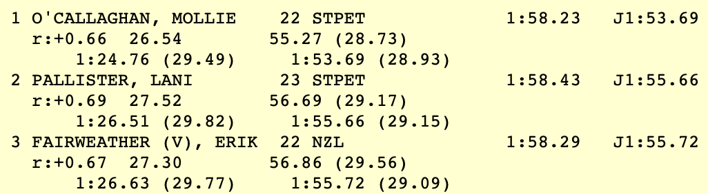 Tra le prove più interessanti, i 400 misti del neozelandese Lewis Clareburt i(4:10.10) e i 200 stile libero femminili dominati da Mollie O’Callaghan (1:53.69), con Lani Pallister a 1.55.66 e le neozelandese Erika Fairweather a 1.55.72.