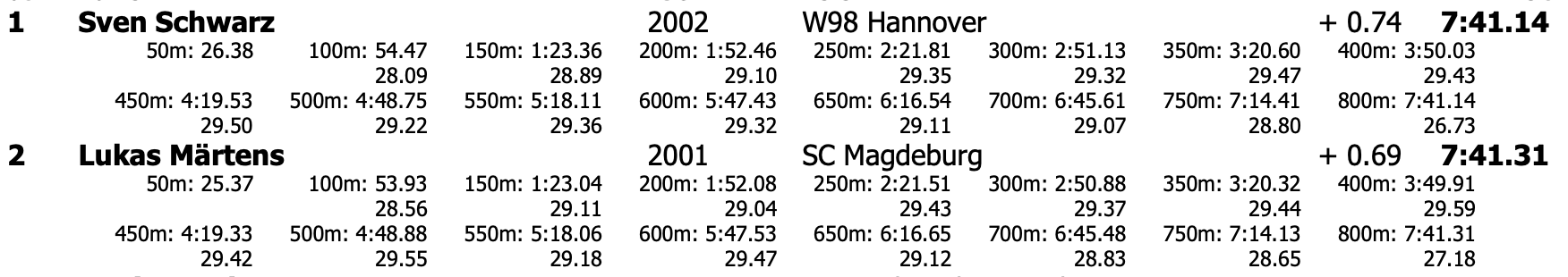 TAG 2. L'avvincente ed attesa sfida negli 800 stile libero maschili tra Sven Schwarz e Lukas Märtens è stata vinta dal primo per soli 17 centesimi di secondo, 7:41.14 contro 7:41.31, rispettivamente la terza e la quarta prestazione mondiale stagionale, ad oggi nei primi sei posti del ranking di specialità figurano ben quattro specialisti tedeschi, tutti compagni di allenamento a Magdeburgo, nell'ordine; Liebmann, Schwarz, Märtens e Klemet.