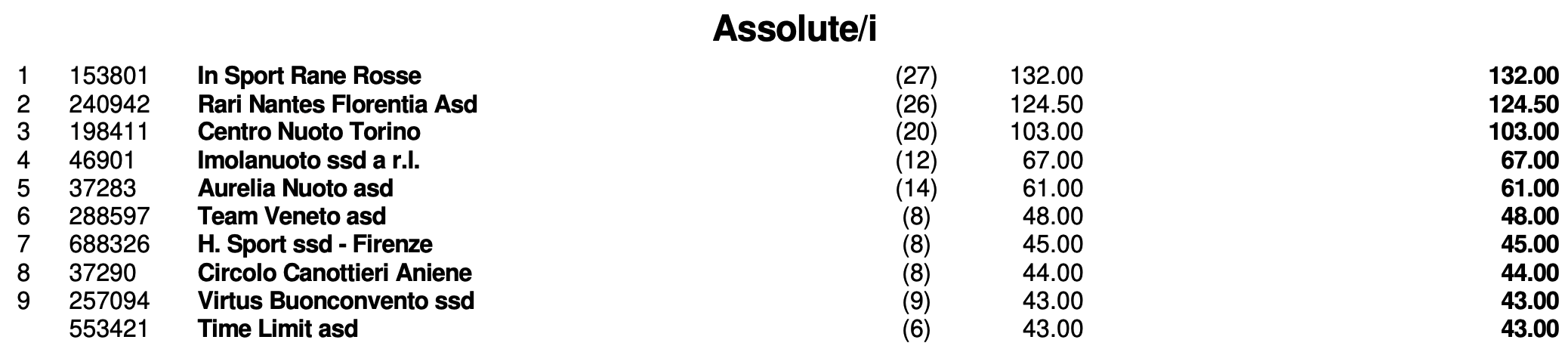Alessandro Ragaini firma i 400 stile libero in 3.41.83, Francesca Pasquino i 50 dorso in 26.99, Matilde Biagiotti i 200 stile libero in 1.56.03, Alessia Polieri i 100 farfalla in 58.40, Federica Toma i 200 dorso in 2.06.36, Anita Gastaldi i 200 misti in 2.08.38.