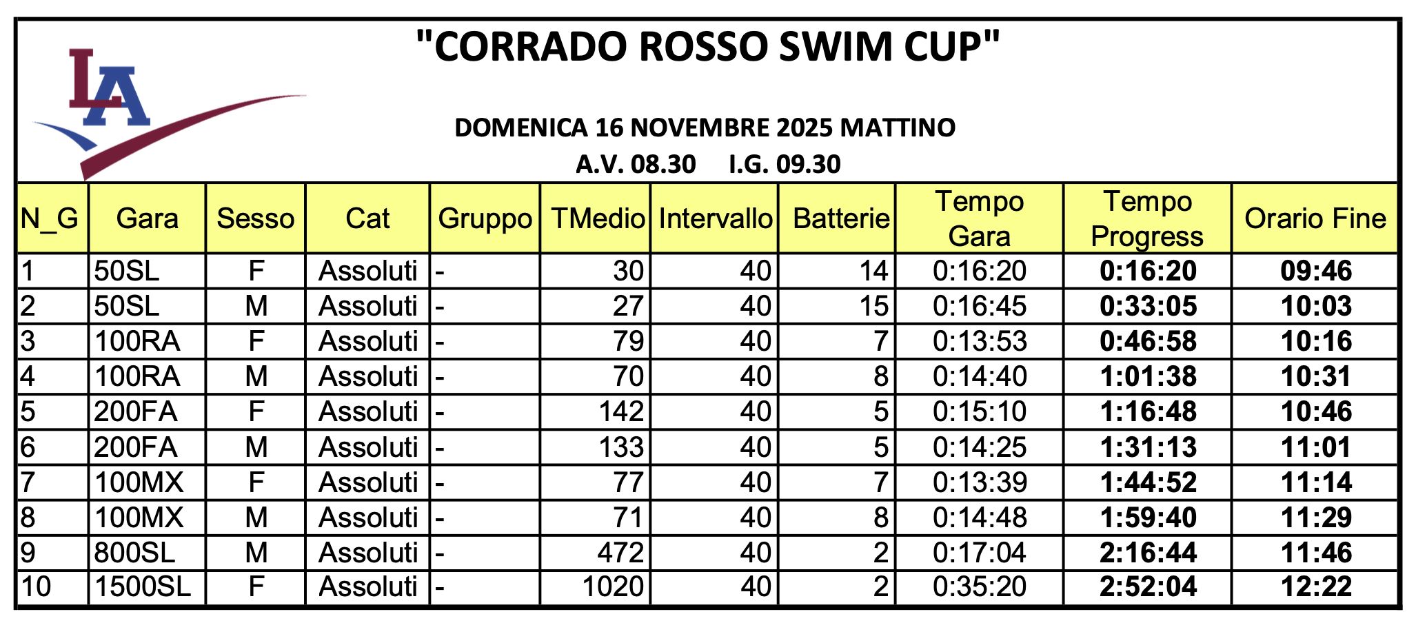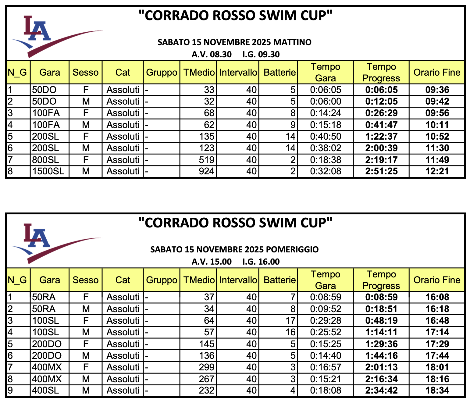 Corrado Rosso Swim Cup. Startlist e Timing.