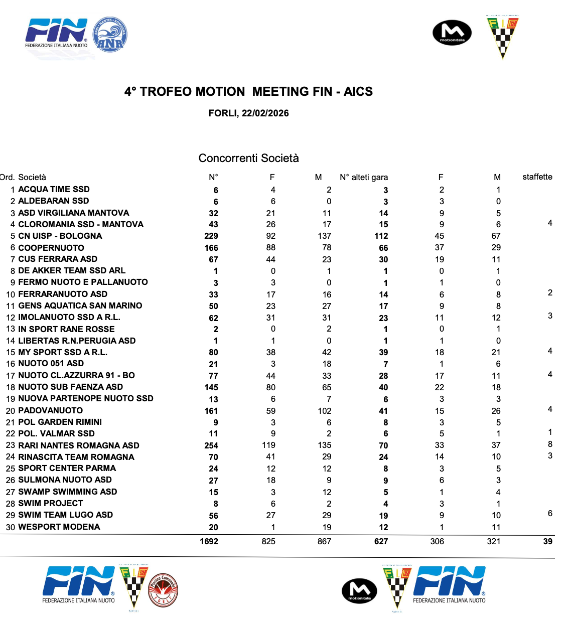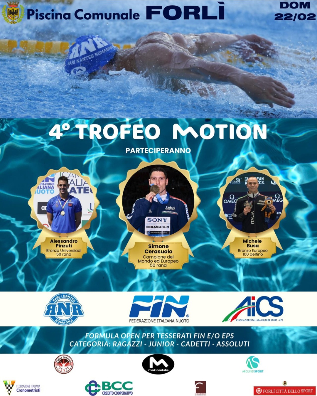 È disponibile l'elenco iscritti della quarta edizione del Trofeo Motion in programma il 22 febbraio in vasca corta presso la piscina comunale di Forlì. Saranno in gara 627 atleti di 30 club, fra loro Simone Cerasuolo, Michele Busa, Alessandro Pinzuti, Chiara Sama, Giorgia Barozzi, Carlotta Giannini, Alex Sabatani, Antonio Gregucci, Guglielmetto Mattia, Bandiera Boris, Perez Daniel, Miron Andrea, Bimbatti Alex, Nanetti Ettore, Romero Bianchi, Mario Anthony ... qui sopra l'elenco iscritti.