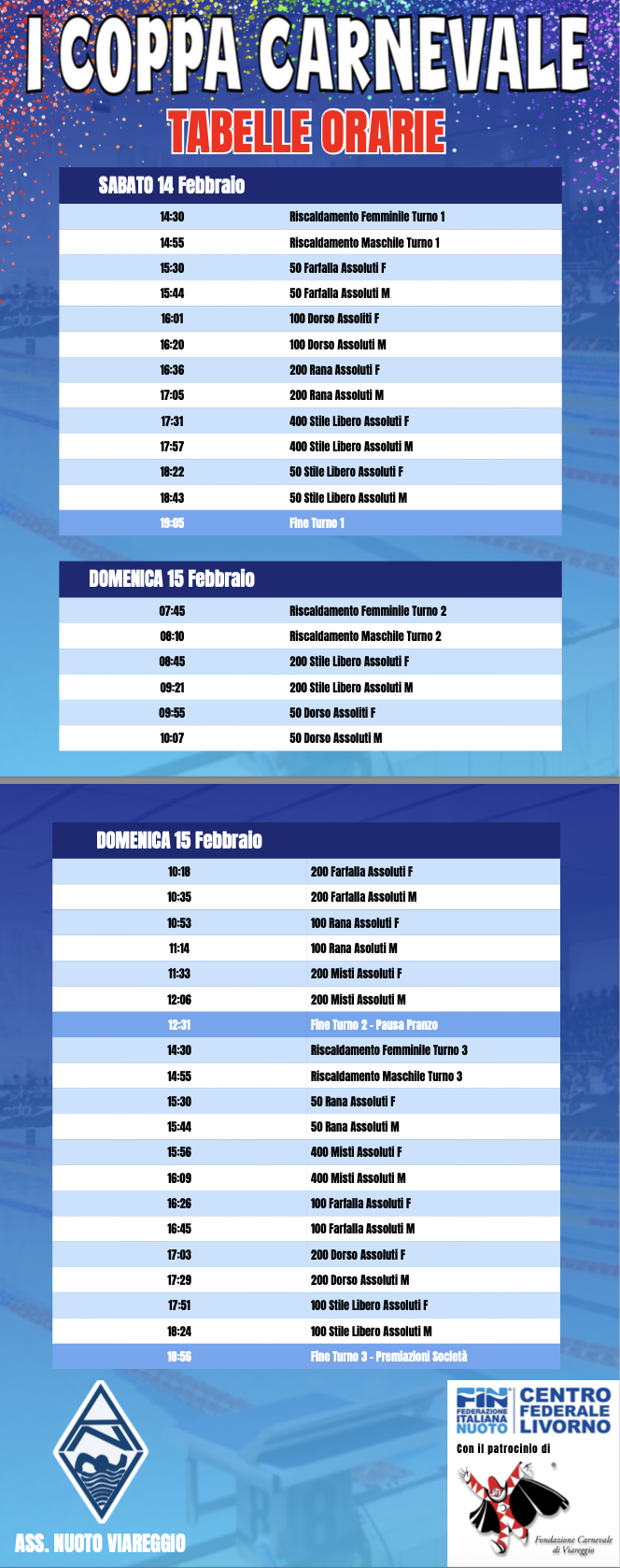 Nel fine settimana Livorno ospiterà la prima edizione della Coppa Carnevale, manifestazione organizzata da Nuoto Viareggio ASD, che vedrà ai blocchi di partenza 627 atleti in rappresentanza di 20 società provenienti da Toscana, Emilia Romagna, Lazio, Lombardia e Umbria.