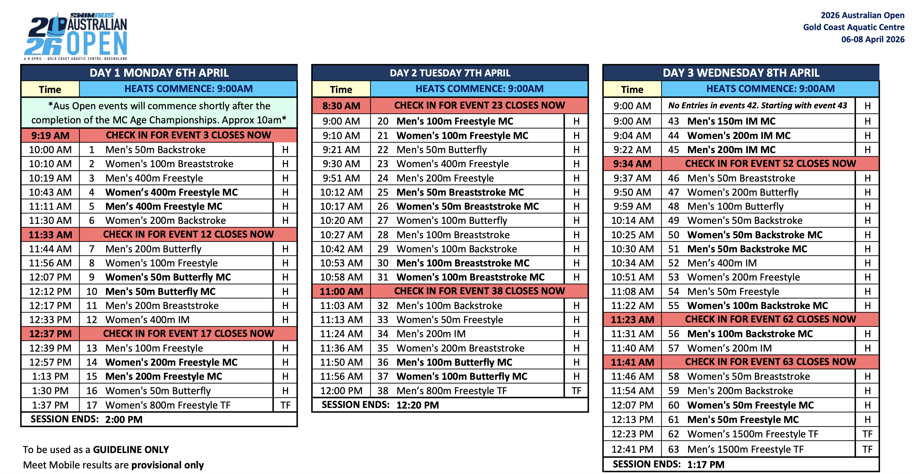 Sono in gara molti BIG del nuoto australiano ed alcuni atleti stranieri; Abbey Webb, Alexandria Perkins, Brittany Castelluzzo, Elizabeth Dekkers, Ella Ramsay, Jenna Forrester, Kaylee McKeown, Lani Pallister, Lily Price, Meg Harris, Mollie O’Callaghan, Olivia Wunsch, Shayna Jack, Sienna Toohey, Tara Kinder, Maria Fernanda Costa, Ai Soma, Erika Fairweather, Ben Armbruster, Bradley Woodward, Brendon Smith, Edward Sommerville, Elijah Winnington, Flynn Southam, Isaac Cooper, Jack Cartwright, Joshua Edwards-Smith, Kai Taylor, Kyle Chalmers, Matthew Temple, Maximillian Giuliani, Samuel Short, Samuel Williamson, Se-Bom Lee, William Petric, Zac Stubblety-Cook, Lewis Clareburt ...